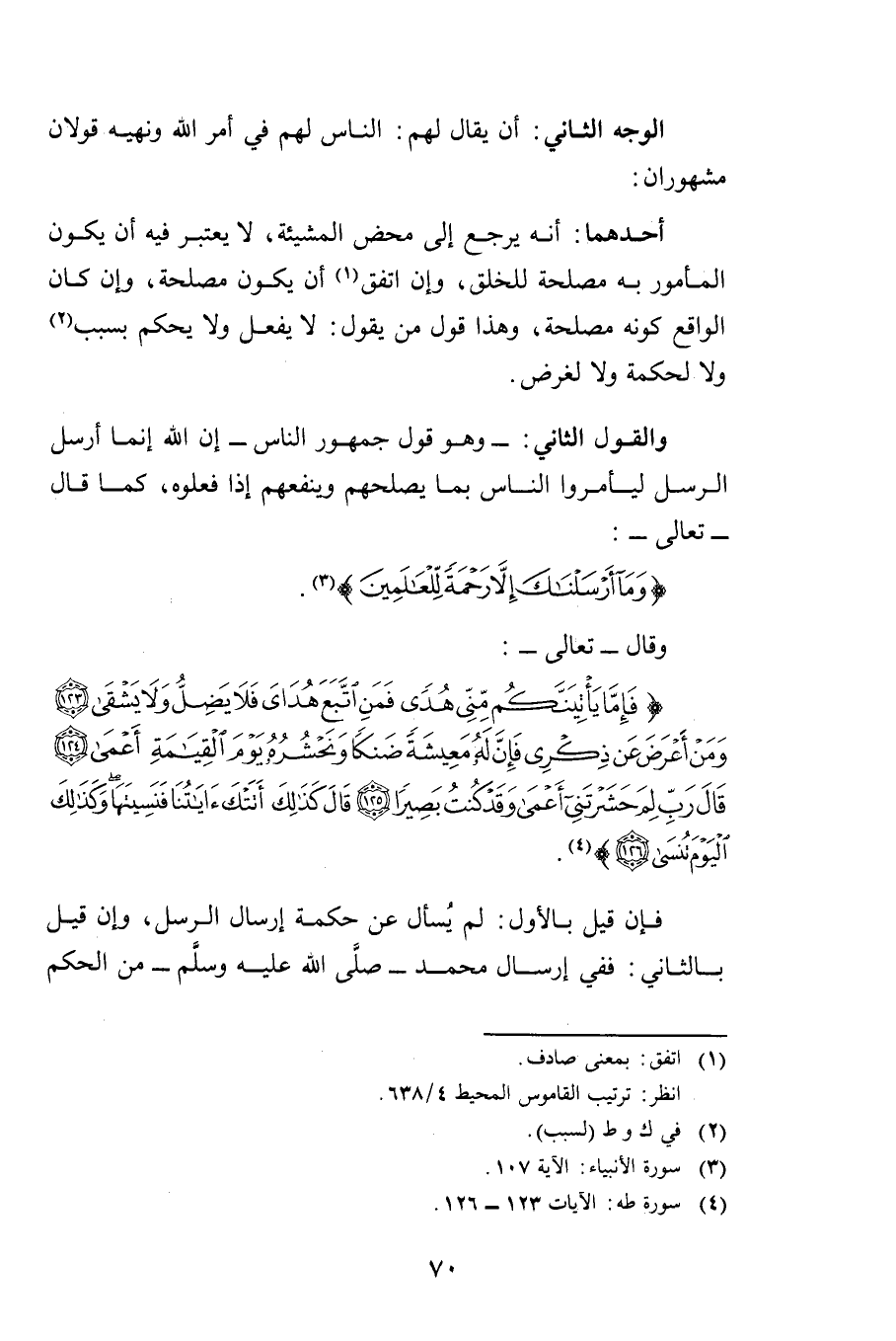 أَحَدُهُمَا: أَنَّهُ يَرْجِعُ إِلَى مَحْضِ الْمَشِيئَةِ، لَا يُعْتَبَرُ فِيهِ أَنْ يَكُونَ الْمَأْمُورُ بِهِ مَصْلَحَةً لِلْخَلْقِ، وَإِنِ اتَّفَقَ أَنْ يَكُونَ مَصْلَحَةً، وَإِنْ كَانَ الْوَاقِعُ كَوْنَهُ مَصْلَحَةً، وَهَذَا قَوْلُ مَنْ يَقُولُ: لَا يَفْعَلُ وَلَا يَحْكُمُ بِسَبَبٍ وَلَا لِحِكْمَةٍ وَلَا لِغَرَضٍ.