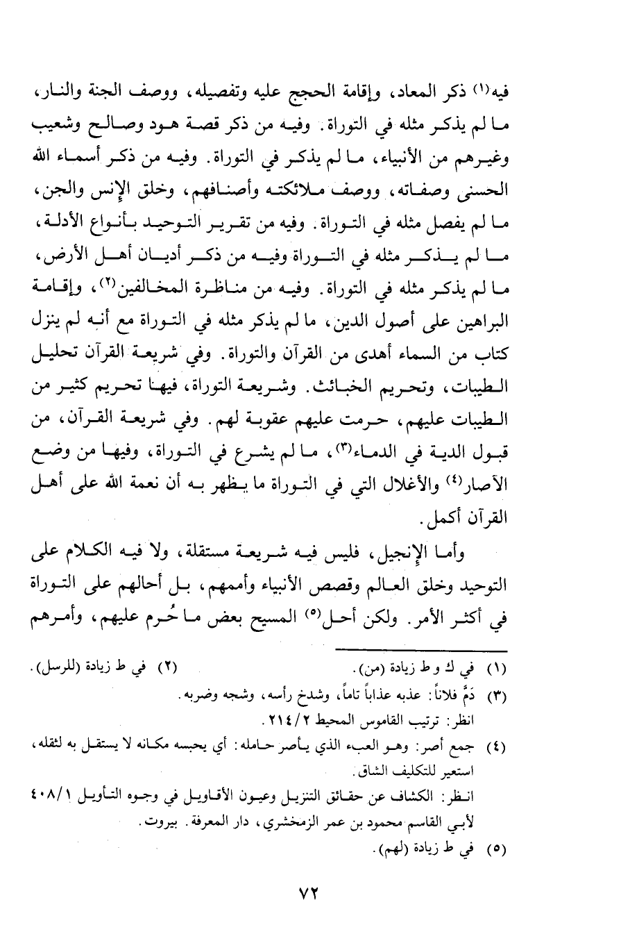 وَأَمَّا الْإِنْجِيلُ؛ فَلَيْسَ فِيهِ شَرِيعَةٌ مُسْتَقِلَّةٌ، وَلَا فِيهِ الْكَلَامُ عَلَى التَّوْحِيدِ وَخَلْقِ الْعَالَمِ وَقَصَصِ الْأَنْبِيَاءِ وَأُمَمِهِمْ، بَلْ أَحَالَهُمْ عَلَى التَّوْرَاةِ فِي أَكْثَرِ الْأَمْرِ. وَلَكِنْ أَحَلَّ الْمَسِيحُ بَعْضَ مَا حُرِّمَ عَلَيْهِمْ، وَأَمَرَهُمْ