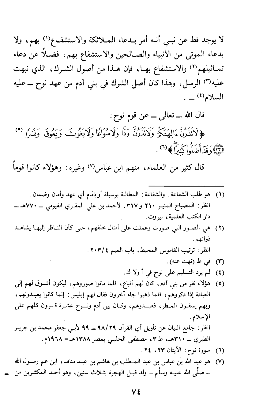 لَا يُوجَدُ قَطُّ عَنْ نَبِيٍّ أَنَّهُ أَمَرَ بِدُعَاءِ الْمَلَائِكَةِ وَالِاسْتِشْفَاعِ بِهِمْ، وَلَا بِدُعَاءِ الْمَوْتَى مِنَ الْأَنْبِيَاءِ وَالصَّالِحِينَ وَالِاسْتِشْفَاعِ بِهِمْ، فَضْلًا عَنْ دُعَاءِ تَمَاثِيلِهِمْ وَالِاسْتِشْفَاعِ بِهَا، فَإِنَّ هَذَا مِنْ أُصُولِ الشِّرْكِ الَّذِي نَبَّهَتْ عَلَيْهِ الرُّسُلُ، وَهَذَا كَانَ أَصْلَ الشِّرْكِ فِي بَنِي آدَمَ مِنْ عَهْدِ نُوحٍ - عَلَيْهِ السَّلَامُ -.