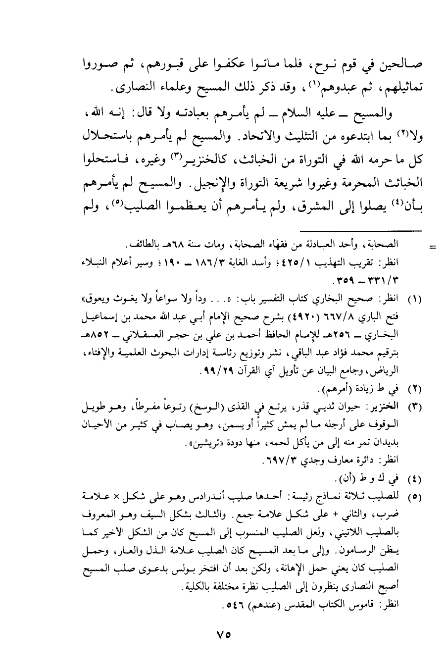 صَالِحِينَ فِي قَوْمِ نُوحٍ، فَلَمَّا مَاتُوا عَكَفُوا عَلَى قُبُورِهِمْ، ثُمَّ صَوَّرُوا تَمَاثِيلَهُمْ، ثُمَّ عَبَدُوهُمْ وَقَدْ ذَكَرَ ذَلِكَ الْمَسِيحُ وَعُلَمَاءُ النَّصَارَى.