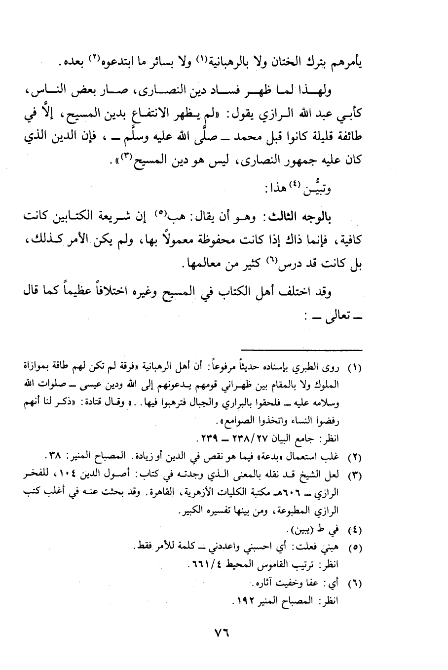 وَلِهَذَا لَمَّا ظَهَرَ فَسَادُ دِينِ النَّصَارَى، صَارَ بَعْضُ النَّاسِ، كَأَبِي عَبْدِ اللَّهِ الرَّازِيِّ يَقُولُ: " لَمْ يَظْهَرِ الِانْتِفَاعُ بِدِينِ الْمَسِيحِ، إِلَّا فِي طَائِفَةٍ قَلِيلَةٍ كَانُوا قَبْلَ مُحَمَّدٍ - صَلَّى اللَّهُ عَلَيْهِ وَسَلَّمَ - فَإِنَّ الدِّينَ الَّذِي كَانَ عَلَيْهِ جُمْهُورُ النَّصَارَى، لَيْسَ هُوَ دِينَ الْمَسِيحِ.