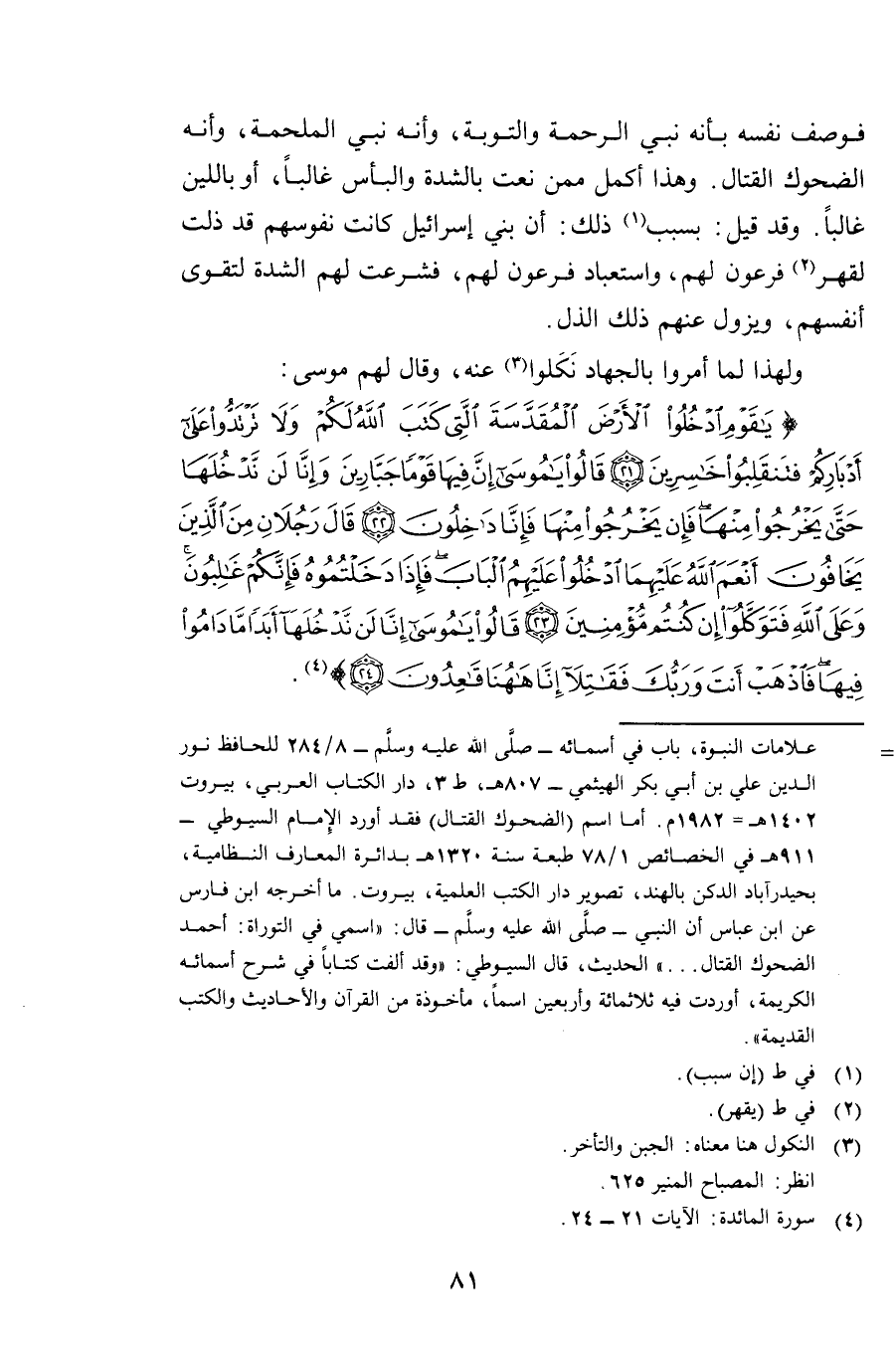 فَوَصَفَ نَفْسَهُ بِأَنَّهُ نَبِيُّ الرَّحْمَةِ وَالتَّوْبَةِ، وَأَنَّهُ نَبِيُّ الْمَلْحَمَةِ، وَأَنَّهُ الضَّحُوكُ الْقَتَّالُ، وَهَذَا أَكْمَلُ مِمَّنْ نُعِتَ بِالشِّدَّةِ وَالْبَأْسِ غَالِبًا، أَوْ بِاللِّينِ غَالِبًا، وَقَدْ قِيلَ بِسَبَبِ ذَلِكَ: أَنَّ بَنِي إِسْرَائِيلَ كَانَتْ نُفُوسُهُمْ قَدْ ذُلَّتْ لِقَهْرِ فِرْعَوْنَ لَهُمْ وَاسْتِعْبَادِ فِرْعَوْنَ لَهُمْ، فَشُرِعَتْ لَهُمُ الشِّدَّةُ لِتَقْوَى أَنْفُسُهُمْ وَيَزُولَ عَنْهُمْ ذَلِكَ الذُّلُّ.