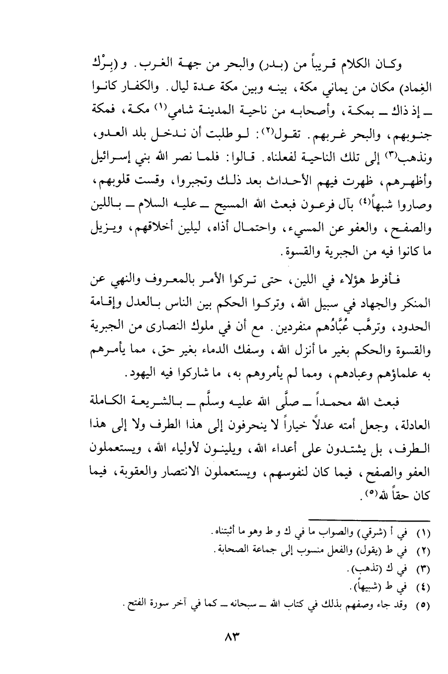فَبَعَثَ اللَّهُ مُحَمَّدًا - صَلَّى اللَّهُ عَلَيْهِ وَسَلَّمَ - بِالشَّرِيعَةِ الْكَامِلَةِ الْعَادِلَةِ، وَجَعَلَ أُمَّتَهُ عَدْلًا خِيَارًا لَا يَنْحَرِفُونَ إِلَى هَذَا الطَّرَفِ وَلَا إِلَى هَذَا الطَّرَفِ، بَلْ يَشْتَدُّونَ عَلَى أَعْدَاءِ اللَّهِ وَيَلِينُونَ لِأَوْلِيَاءِ اللَّهِ وَيَسْتَعْمِلُونَ الْعَفْوَ وَالصَّفْحَ فِيمَا كَانَ لِنُفُوسِهِمْ، وَيَسْتَعْمِلُونَ الِانْتِصَارَ وَالْعُقُوبَةَ فِيمَا كَانَ حَقًّا لِلَّهِ.