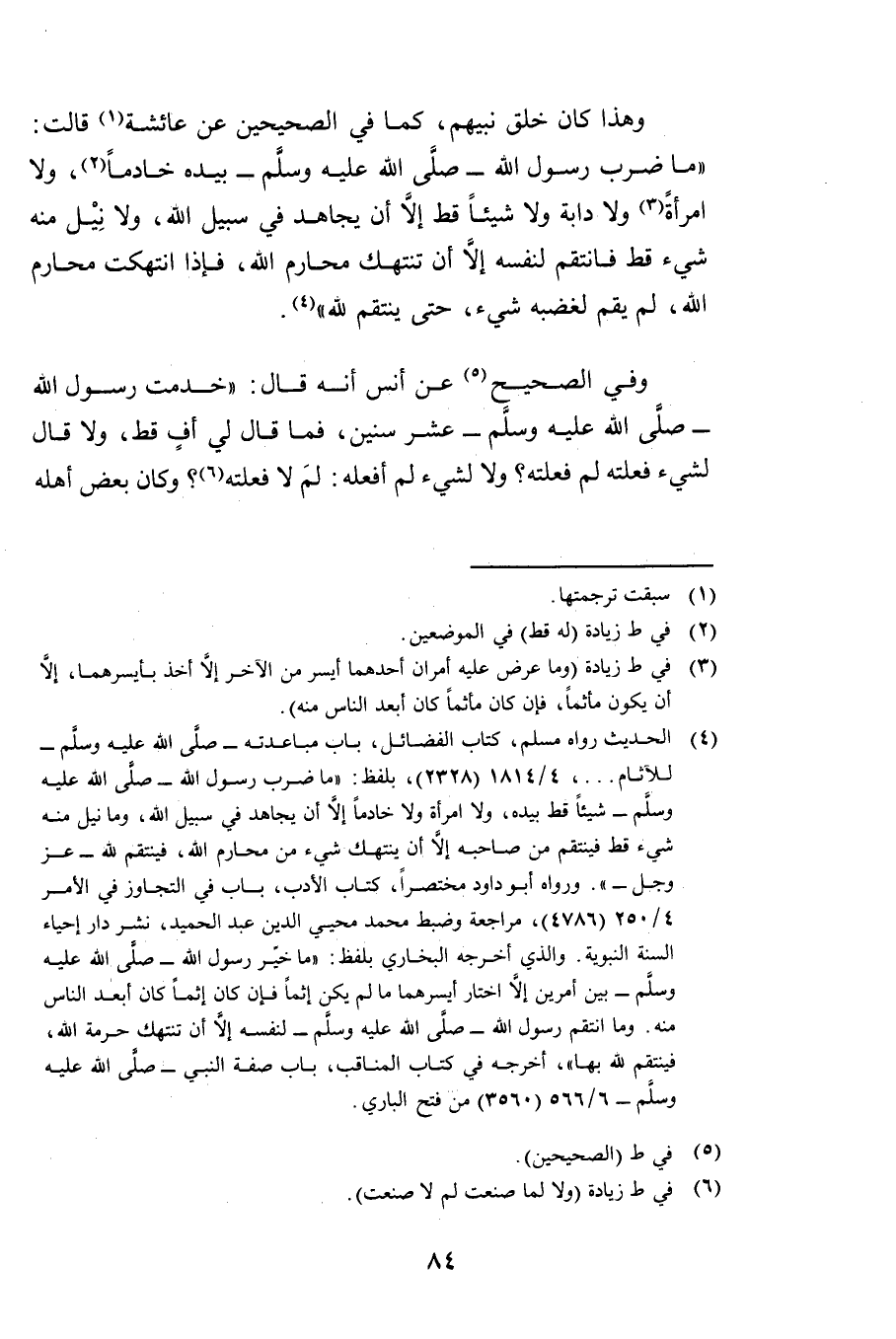 وَهَذَا كَانَ خُلُقَ نَبِيِّهِمْ، كَمَا فِي الصَّحِيحَيْنِ عَنْ عَائِشَةَ قَالَتْ: " «مَا ضَرَبَ رَسُولُ اللَّهِ بِيَدِهِ خَادِمًا وَلَا امْرَأَةً وَلَا دَابَّةً وَلَا شَيْئًا قَطُّ، إِلَّا أَنْ يُجَاهِدَ فِي سَبِيلِ اللَّهِ، وَلَا نِيلَ مِنْهُ شَيْءٌ قَطُّ فَانْتَقَمَ لِنَفْسِهِ، إِلَّا أَنْ تُنْتَهَكَ مَحَارِمُ اللَّهِ، فَإِذَا انْتُهِكَتْ مَحَارِمُ اللَّهِ لَمْ يَقُمْ لِغَضَبِهِ شَيْءٌ حَتَّى يَنْتَقِمَ لِلَّهِ» ".