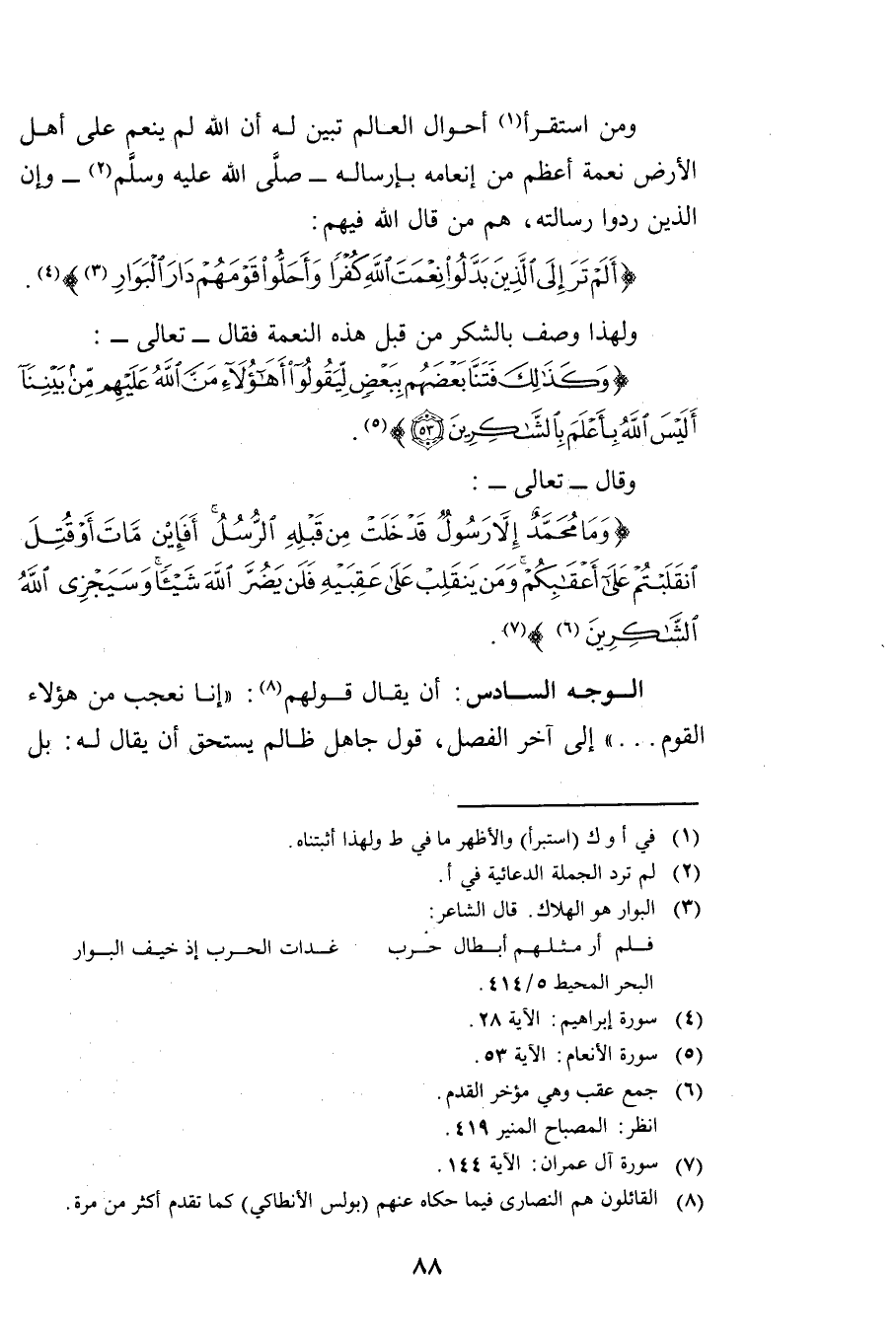 وَمَنِ اسْتَقْرَأَ أَحْوَالَ الْعَالَمِ تَبَيَّنَ لَهُ أَنَّ اللَّهَ لَمْ يُنْعِمْ عَلَى أَهْلِ الْأَرْضِ نِعْمَةً أَعْظَمَ مِنْ إِنْعَامِهِ بِإِرْسَالِهِ - صَلَّى اللَّهُ عَلَيْهِ وَسَلَّمَ - وَإِنَّ الَّذِينَ رَدُّوا رِسَالَتَهُ هُمْ مَنْ قَالَ اللَّهُ فِيهِمْ: