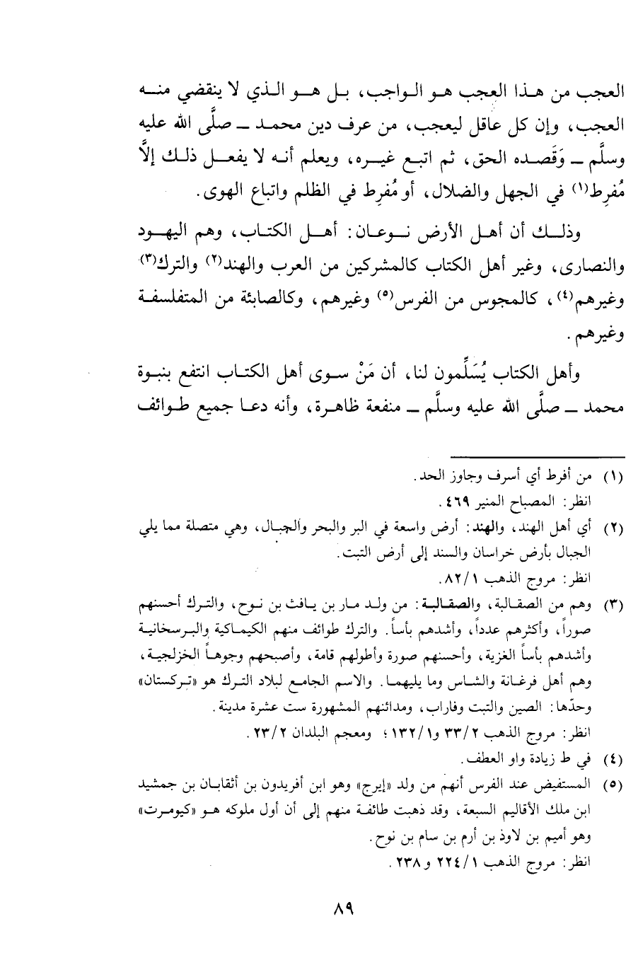 وَذَلِكَ أَنَّ أَهْلَ الْأَرْضِ نَوْعَانِ: أَهْلُ الْكِتَابِ وَهُمُ الْيَهُودُ وَالنَّصَارَى، وَغَيْرُ أَهْلِ الْكِتَابِ كَالْمُشْرِكِينَ مِنَ الْعَرَبِ وَالْهِنْدِ وَالتُّرْكِ، وَغَيْرِهِمْ كَالْمَجُوسِ مِنَ الْفُرْسِ، وَغَيْرِهِمْ كَالصَّابِئَةِ مِنَ الْمُتَفَلْسِفَةِ، وَغَيْرِهِمْ.