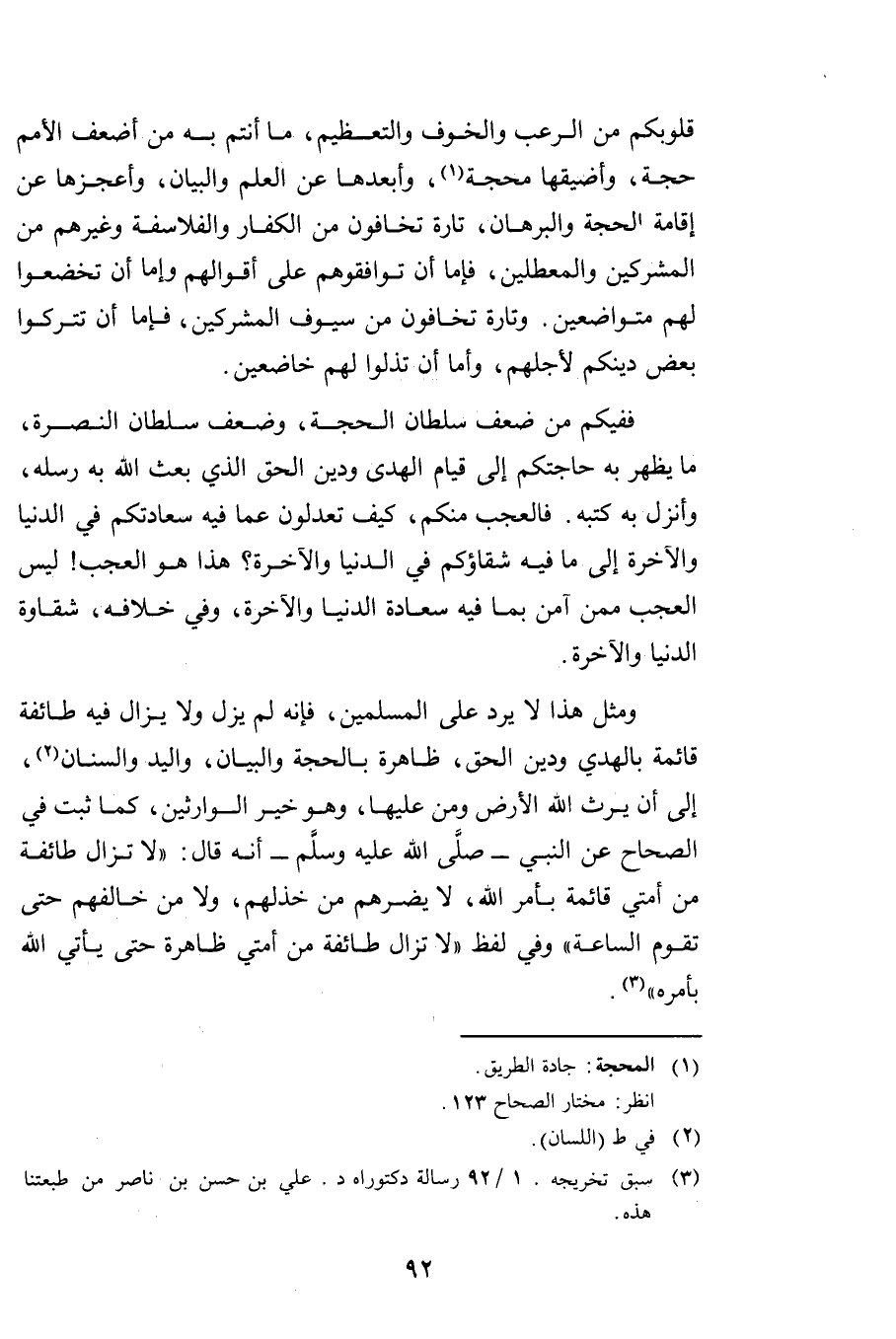 فَفِيكُمْ مِنْ ضَعْفِ سُلْطَانِ الْحُجَّةِ، وَضَعْفِ سُلْطَانِ النُّصْرَةِ مَا يَظْهَرُ بِهِ حَاجَتُكُمْ إِلَى قِيَامِ الْهُدَى وَدِينِ الْحَقِّ الَّذِي بَعَثَ اللَّهُ بِهِ رُسُلَهُ، وَأَنْزَلَ بِهِ كُتُبَهُ فَالْعَجَبُ مِنْكُمْ كَيْفَ تَعْدِلُونَ عَمَّا فِيهِ سَعَادَتُكُمْ فِي الدُّنْيَا وَالْآخِرَةِ إِلَى مَا فِيهِ شَقَاؤُكُمْ فِي الدُّنْيَا وَالْآخِرَةِ. هَذَا هُوَ الْعَجَبُ لَيْسَ الْعَجَبُ مِمَّنْ آمَنَ بِمَا فِيهِ سَعَادَةُ الدُّنْيَا وَالْآخِرَةِ وَفِي خِلَافِهِ شَقَاوَةُ الدُّنْيَا وَالْآخِرَةِ.