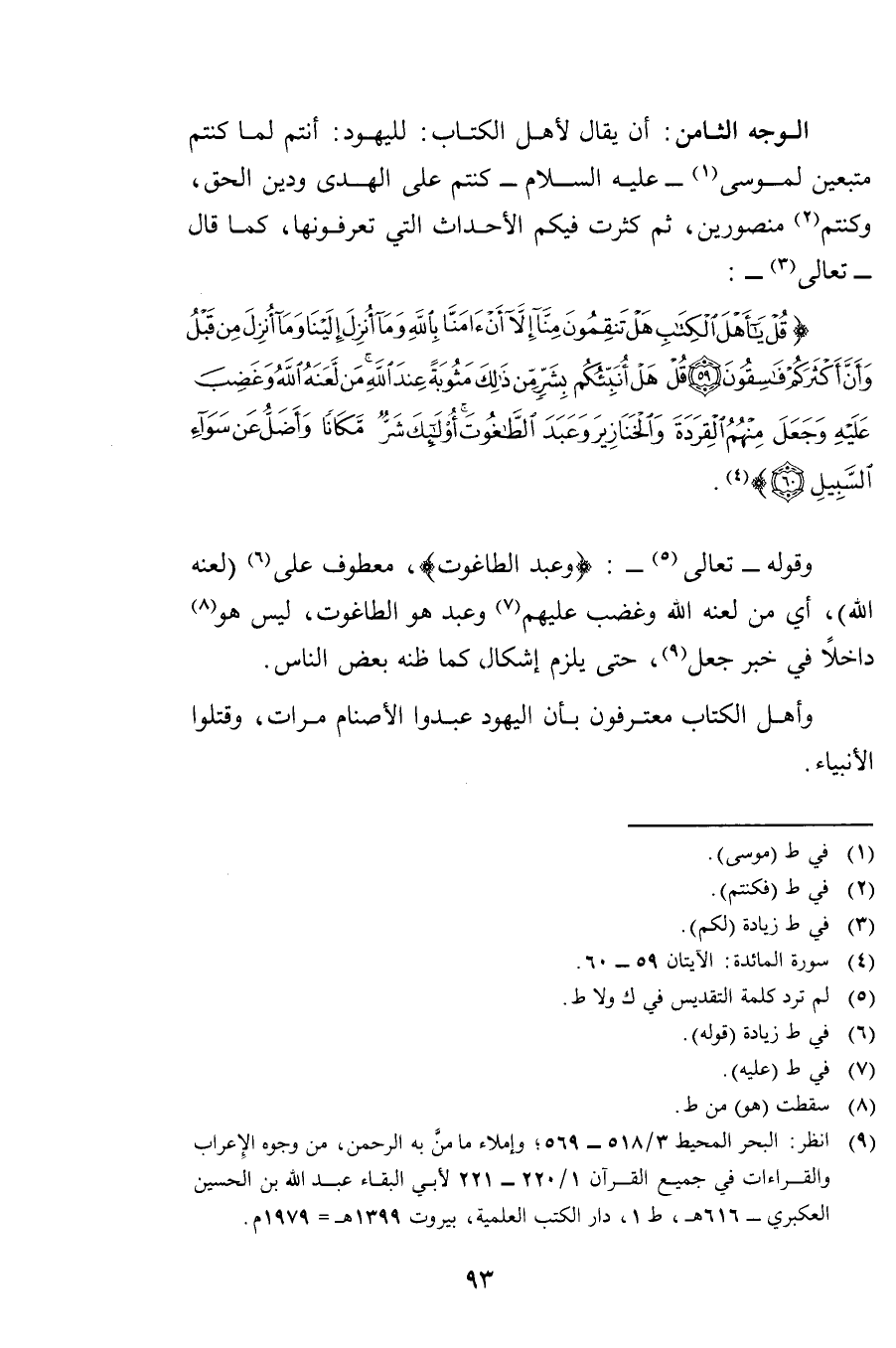 الْوَجْهُ الثَّامِنُ: أَنْ يُقَالَ لِأَهْلِ الْكِتَابِ: لِلْيَهُودِ: أَنْتُمْ لَمَّا كُنْتُمْ مُتَّبِعِينَ لِمُوسَى - عَلَيْهِ السَّلَامُ - كُنْتُمْ عَلَى الْهُدَى وَدِينِ الْحَقِّ وَكُنْتُمْ مَنْصُورِينَ، ثُمَّ كَثُرَتْ فِيكُمُ الْأَحْدَاثُ الَّتِي تَعْرِفُونَهَا كَمَا قَالَ - تَعَالَى -: