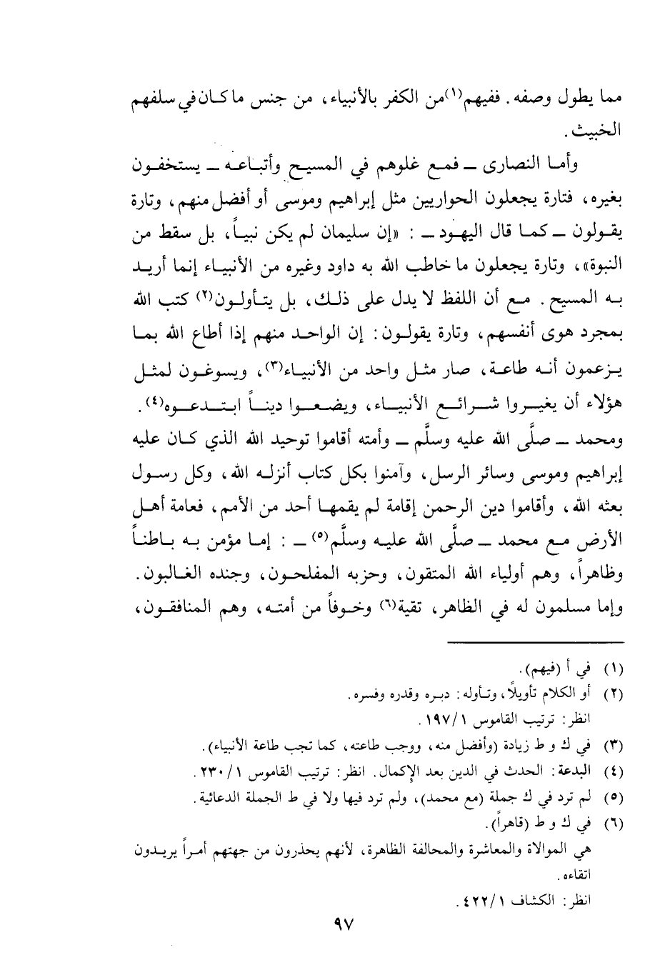 وَأَمَّا النَّصَارَى - فَمَعَ غُلُوِّهِمْ فِي الْمَسِيحِ وَأَتْبَاعِهِ - يَسْتَخِفُّونَ بِغَيْرِهِ فَتَارَةً يَجْعَلُونَ الْحَوَارِيِّينَ مِثْلَ إِبْرَاهِيمَ وَمُوسَى أَوْ أَفْضَلَ مِنْهُمْ، وَتَارَةً يَقُولُونَ - كَمَا قَالَ الْيَهُودُ -: " إِنَّ سُلَيْمَانَ لَمْ يَكُنْ نَبِيًّا بَلْ سَقَطَ مِنَ النُّبُوَّةِ "، وَتَارَةً يَجْعَلُونَ مَا خَاطَبَ اللَّهُ بِهِ دَاوُدَ وَغَيْرَهُ مِنَ الْأَنْبِيَاءِ إِنَّمَا أُرِيدَ بِهِ الْمَسِيحُ، مَعَ أَنَّ اللَّفْظَ لَا يَدُلُّ عَلَى ذَلِكَ، بَلْ يَتَأَوَّلُونَ كُتُبَ اللَّهِ بِمُجَرَّدِ هَوَى أَنْفُسِهِمْ، وَتَارَةً يَقُولُونَ: إِنَّ الْوَاحِدَ مِنْهُمْ إِذَا أَطَاعَ اللَّهَ بِمَا يَزْعُمُونَ أَنَّهُ طَاعَةٌ، صَارَ مِثْلَ وَاحِدٍ مِنَ الْأَنْبِيَاءِ، وَيُسَوِّغُونَ لِمِثْلِ هَؤُلَاءِ أَنْ يُغَيِّرُوا شَرَائِعَ الْأَنْبِيَاءِ وَيَضَعُوا دِينًا ابْتَدَعُوهُ وَمُحَمَّدٌ - صَلَّى اللَّهُ عَلَيْهِ وَسَلَّمَ - وَأُمَّتُهُ أَقَامُوا تَوْحِيدَ اللَّهِ الَّذِي كَانَ عَلَيْهِ إِبْرَاهِيمُ وَمُوسَى وَسَائِرُ الرُّسُلِ وَآمَنُوا بِكُلِّ كِتَابٍ أَنْزَلَهُ اللَّهُ وَكُلِّ رَسُولٍ بَعَثَهُ اللَّهُ، وَأَقَامُوا دِينَ الرَّحْمَنِ إِقَامَةً لَمْ يُقِمْهَا أَحَدٌ مِنَ الْأُمَمِ. فَعَامَّةُ أَهْلِ الْأَرْضِ مَعَ مُحَمَّدٍ - صَلَّى اللَّهُ عَلَيْهِ وَسَلَّمَ -: إِمَّا مُؤْمِنٌ بِهِ بَاطِنًا وَظَاهِرًا - وَهُمْ أَوْلِيَاءُ اللَّهِ الْمُتَّقُونَ وَحِزْبُهُ الْمُفْلِحُونَ وَجُنْدُهُ الْغَالِبُونَ - وَإِمَّا مُسْلِمُونَ لَهُ فِي الظَّاهِرِ تَقِيَّةً وَخَوْفًا مِنْ أُمَّتِهِ، وَهُمُ الْمُنَافِقُونَ.