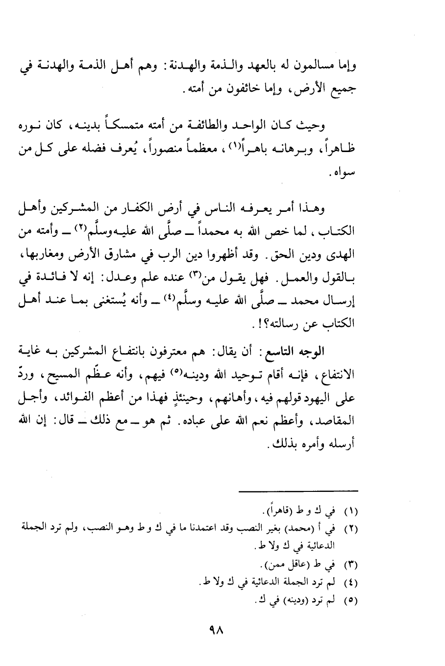 وَحَيْثُ كَانَ الْوَاحِدُ وَالطَّائِفَةُ مِنْ أُمَّتِهِ مُتَمَسِّكًا بِدِينِهِ، كَانَ نُورُهُ ظَاهِرًا وَبُرْهَانُهُ بَاهِرًا مُعَظَّمًا مَنْصُورًا، يُعْرَفُ فَضْلُهُ عَلَى كُلِّ مَنْ سِوَاهُ.