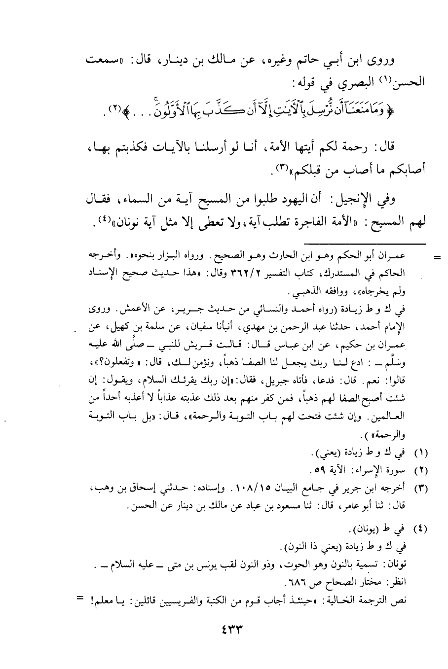 وَفِي الْإِنْجِيلِ: أَنَّ الْيَهُودَ طَلَبُوا مِنَ الْمَسِيحِ آيَةً مِنَ السَّمَاءِ فَقَالَ لَهُمُ الْمَسِيحُ: الْأُمَّةُ الْفَاجِرَةُ تَطْلُبُ آيَةً، وَلَا تُعْطَى إِلَّا مِثْلَ آيَةِ نُونَانَ