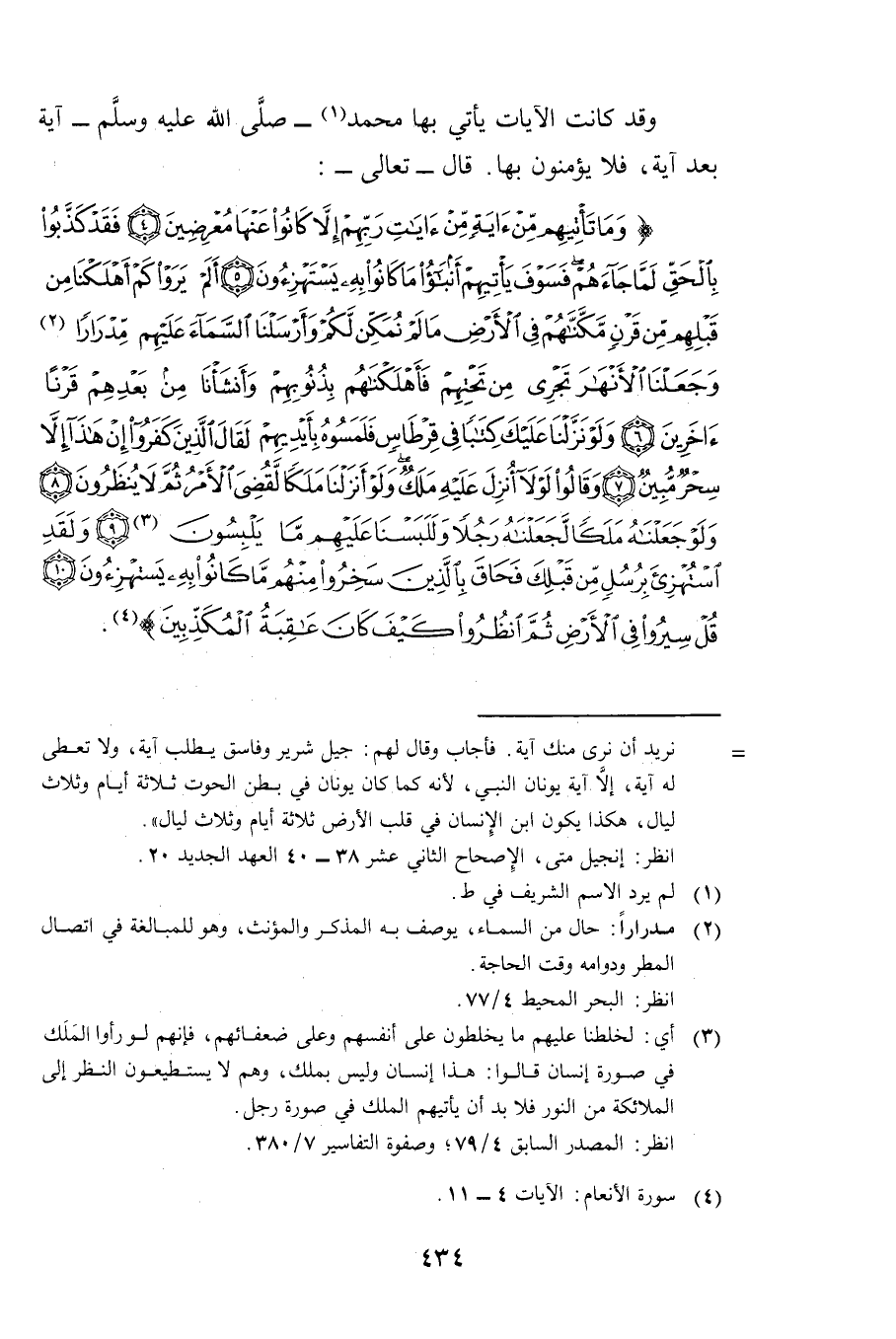 {وَمَا تَأْتِيهِمْ مِنْ آيَةٍ مِنْ آيَاتِ رَبِّهِمْ إِلَّا كَانُوا عَنْهَا مُعْرِضِينَ} [الأنعام: 4] (4) {فَقَدْ كَذَّبُوا بِالْحَقِّ لَمَّا جَاءَهُمْ فَسَوْفَ يَأْتِيهِمْ أَنْبَاءُ مَا كَانُوا بِهِ يَسْتَهْزِئُونَ} [الأنعام: 5] (5) {أَلَمْ يَرَوْا كَمْ أَهْلَكْنَا مِنْ قَبْلِهِمْ مِنْ قَرْنٍ مَكَّنَّاهُمْ فِي الْأَرْضِ مَا لَمْ نُمَكِّنْ لَكُمْ وَأَرْسَلْنَا السَّمَاءَ عَلَيْهِمْ مِدْرَارًا وَجَعَلْنَا الْأَنْهَارَ تَجْرِي مِنْ تَحْتِهِمْ فَأَهْلَكْنَاهُمْ بِذُنُوبِهِمْ وَأَنْشَأْنَا مِنْ بَعْدِهِمْ قَرْنًا آخَرِينَ} [الأنعام: 6] (6) {وَلَوْ نَزَّلْنَا عَلَيْكَ كِتَابًا فِي قِرْطَاسٍ فَلَمَسُوهُ بِأَيْدِيهِمْ لَقَالَ الَّذِينَ كَفَرُوا إِنْ هَذَا إِلَّا سِحْرٌ مُبِينٌ} [الأنعام: 7] (7) {وَقَالُوا لَوْلَا أُنْزِلَ عَلَيْهِ مَلَكٌ وَلَوْ أَنْزَلْنَا مَلَكًا لَقُضِيَ الْأَمْرُ ثُمَّ لَا يُنْظَرُونَ} [الأنعام: 8] (8) {وَلَوْ جَعَلْنَاهُ مَلَكًا لَجَعَلْنَاهُ رَجُلًا وَلَلَبَسْنَا عَلَيْهِمْ مَا يَلْبِسُونَ} [الأنعام: 9] (9) {وَلَقَدِ اسْتُهْزِئَ بِرُسُلٍ مِنْ قَبْلِكَ فَحَاقَ بِالَّذِينَ سَخِرُوا مِنْهُمْ مَا كَانُوا بِهِ يَسْتَهْزِئُونَ} [الأنعام: 10] (10) {قُلْ سِيرُوا فِي الْأَرْضِ ثُمَّ انْظُرُوا كَيْفَ كَانَ عَاقِبَةُ الْمُكَذِّبِينَ} [الأنعام: 11]