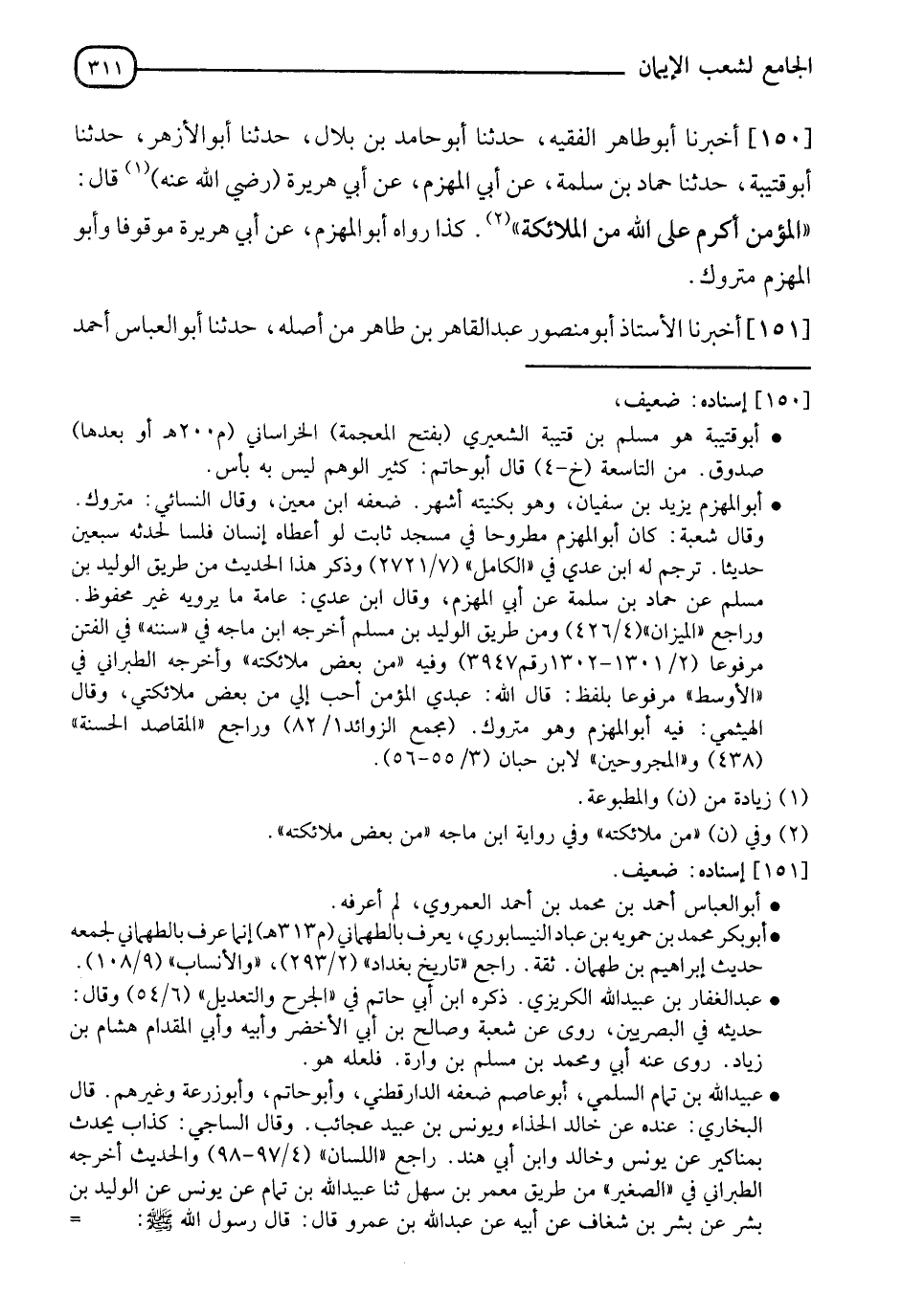 150 - أَخْبَرَنَا أَبُو طَاهِرٍ الْفَقِيهُ، حدثنا أَبُو حَامِدِ بْنُ بِلَالٍ، حدثنا أَبُو الْأَزْهَرِ، حدثنا أَبُو قُتَيْبَةَ، حدثنا حَمَّادُ بْنُ سَلَمَةَ، عَنْ أَبِي الْمُهَزِّمِ، عَنْ أَبِي هُرَيْرَةَ رَضِيَ اللهُ عَنْهُ قَالَ: §" الْمُؤْمِنُ أَكْرَمُ عَلَى اللهِ مِنَ الْمَلَائِكَةِ " " كَذَا رَوَاهُ أَبُو الْمُهَزِّمِ، عَنْ أَبِي هُرَيْرَةَ مَوْقُوفًا، وَأَبُو الْمُهَزِّمِ مَتْرُوكٌ "