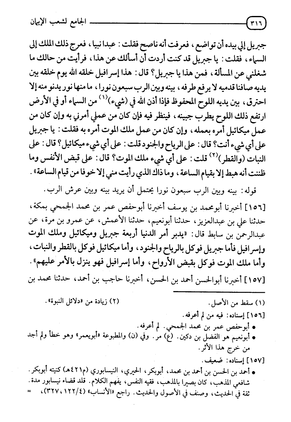 156 - أَخْبَرَنَا أَبُو مُحَمَّدِ بْنُ يُوسُفَ، أَخْبَرَنَا أَبُو حَفْصٍ عُمَرُ بْنُ مُحَمَّدٍ الْجُمَحِيُّ بِمَكَّةَ، حدثنا عَلِيُّ بْنُ عَبْدِ الْعَزِيزِ، حدثنا أَبُو نُعَيْمٍ، حدثنا الْأَعْمَشُ، عَنْ عَمْرِو بْنِ مُرَّةَ، عَنْ عَبْدِ الرَّحْمَنِ بْنِ سَابِطٍ قَالَ: " §يُدَبِّرُ أَمْرَ الدُّنْيَا أَرْبَعَةٌ: جِبْرِيلُ، وَمِيكَائِيلُ، وَمَلَكُ الْمَوْتِ، وَإِسْرَافِيلُ. فَأَمَّا جِبْرِيلُ: فَوُكِّلَ بِالرِّيَاحِ وَالْجُنُودِ، وَأَمَّا مِيكَائِيلُ: فَوُكِّلَ بِالْقَطْرِ وَالنَّبَاتِ، وَأَمَّا مَلَكُ الْمَوْتِ: فَوُكِّلَ بِقَبْضِ الْأَرْوَاحِ، وَأَمَّا إِسْرَافِيلُ: فَهُوَ يَنْزِلُ بِالْأَمْرِ عَلَيْهِمْ "
