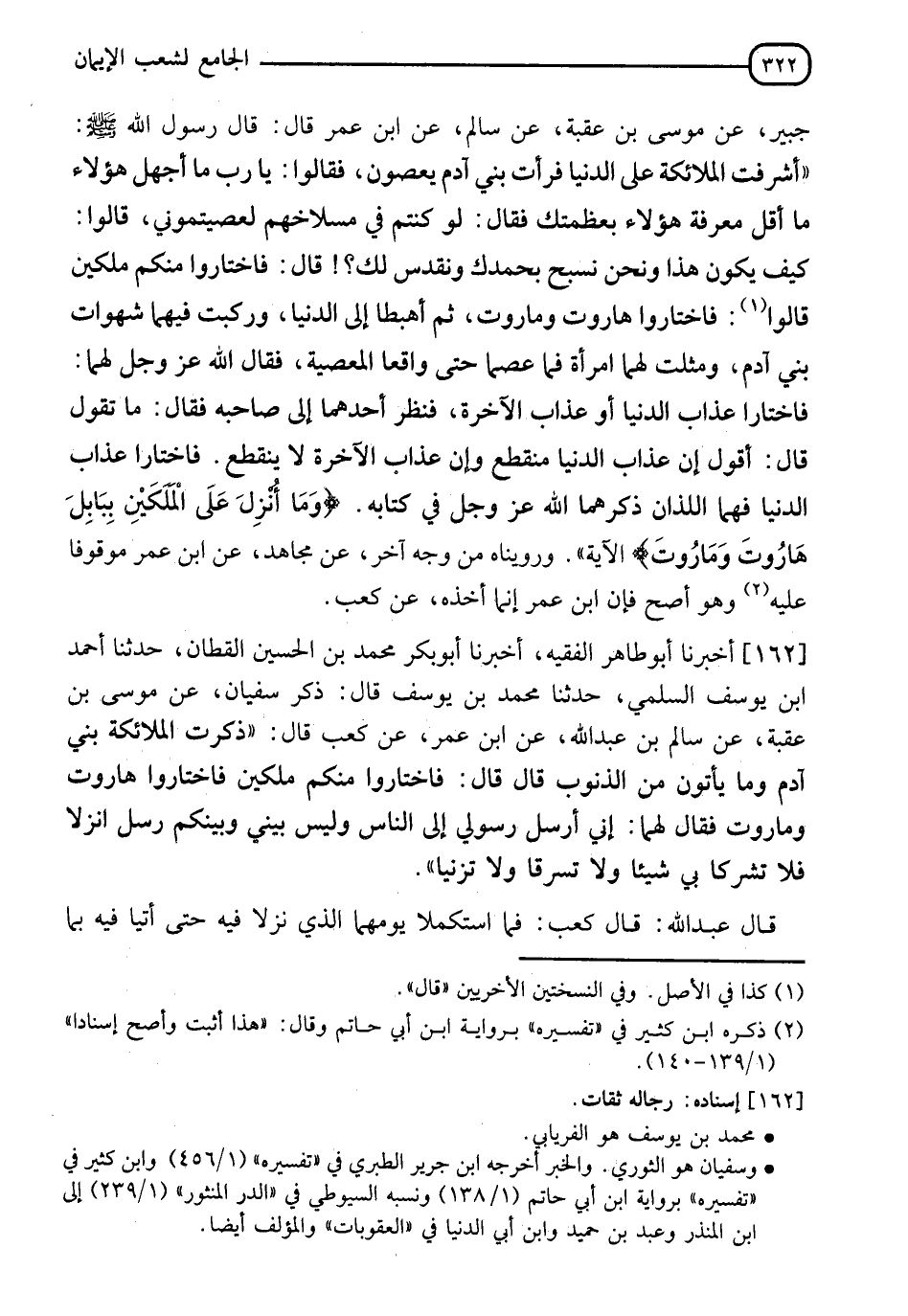 162 - أَخْبَرَنَا أَبُو طَاهِرٍ الْفَقِيهُ، أَخْبَرَنَا أَبُو بَكْرٍ مُحَمَّدُ بْنُ الْحُسَيْنِ الْقَطَّانُ، حدثنا أَحْمَدُ بْنُ يُوسُفَ السُّلَمِيُّ، حدثنا حَمَدُ بْنُ يُوسُفَ، قَالَ: ذَكَرَ سُفْيَانُ، عَنْ مُوسَى بْنِ عُقْبَةَ، عَنْ سَالِمِ بْنِ عَبْدِ اللهِ، عَنِ ابْنِ عُمَرَ، عَنْ كَعْبٍ قَالَ: " §ذَكَرَتِ الْمَلَائِكَةُ بَنِي آدَمَ، وَمَا يَأْتُونَ مِنَ الذُّنُوبِ قال: قَالَ: فَاخْتَارُوا مِنْكُمْ مَلَكَيْنِ فَاخْتَارُوا هَارُوتَ وَمَارُوتَ، فَقَالَ لَهُمَا: إِنِّي أُرْسِلُ رَسُولِي إِلَى النَّاسِ ولَيْسَ بَيْنِي وَبَيْنَكُمْ رُسُلٌ، انْزِلَا فَلَا تُشْرِكَا بِي شَيْئًا، وَلَا تَسْرِقَا، وَلَا تَزْنِيَا " قَالَ عَبْدُ اللهِ: قَالَ كَعْبٌ: " فَمَا اسْتَكْمَلَا يَوْمَهُمَا الَّذِي نَزَلَا فِيهِ حَتَّى أَتَيَا فِيهِ بمَا -[323]- حُرِّمَ عَلَيْهِمَا " وَهَذَا أَشْبَهُ أَنْ يَكُونَ مَحْفُوظًا. وَرُوِي فِي ذَلِكَ عَنْ عَلِيِّ بْنِ أَبِي طَالِبٍ رَضِيَ اللهُ عَنْهُ " وَمَنْ قَالَ: بِالْقَوْلِ الْآخَرِ أَشْبَهُ أَنْ يَقُولَ: إِذَا كَانَ التَّوْفِيقُ لِلطَّاعَةِ، وَالْمَعْصِيَةِ مِنَ اللهِ عَزَّ وَجَلَّ وَجَبَ أَنْ يَكُونَ الْأَفْضَلُ مَنْ كَانَ تَوْفِيقُهُ لَهُ وَعِصْمَتُهُ إِيَّاهُ أَكْثَرَ، وَوَجَدْنَا الطَّاعَةَ الَّتِي وُجُودُهَا بِتَوْفِيقِهِ، وَعِصْمَتِهِ مِنَ الْمَلَائِكَةِ أَكْثَرَ فَوَجَبَ أَنْ يَكُونُوا كَذَلِكَ، وَذَكَرَ الْحَلِيمِيُّ رَحِمَهُ اللهُ تَوْجِيهَ الْقَوْلَيْنِ وَلَمْ أَنْقُلْهُ، وَاخْتَارَ تَفْضِيلَ الْمَلَائِكَةِ، وَأَكْثَرُ أَصْحَابِنَا ذَهَبُوا إِلَى الْقَوْلِ الْأَوَّلِ، وَالْأَمْرُ فِيهِ سَهْلٌ، وَلَيْسَ فِيهِ مِنَ الْفَائِدَةِ إِلَّا مَعْرِفَةُ الشيء عَلَى مَا هُوَ بِهِ وَبِاللهِ التَّوْفِيقُ "
