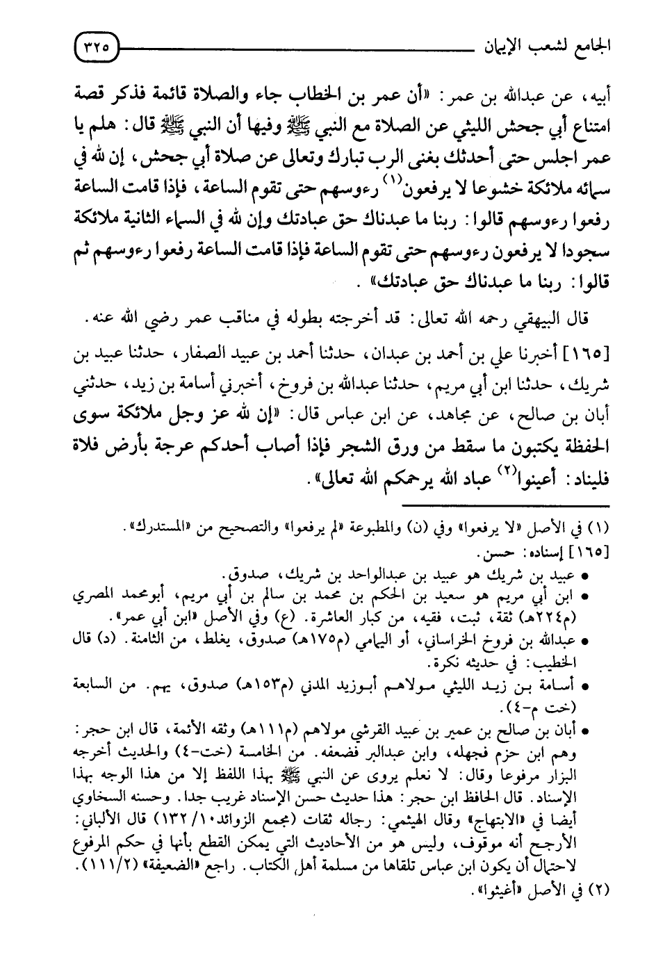165 - أَخْبَرَنَا عَلِيُّ بْنُ أَحْمَدَ بْنِ عَبْدَانَ، حدثنا أَحْمَدُ بْنُ عُبَيْدٍ الصَّفَّارُ، حدثنا عُبَيْدُ بْنُ شَرِيكٍ، حدثنا ابْنُ أَبِي مَرْيَمَ، حدثنا عَبْدُ اللهِ بْنُ فَرُّوخٍ، أَخْبَرَنِي أُسَامَةُ بْنُ زَيْدٍ، حَدَّثَنِي أَبَانُ بْنُ صَالِحٍ، عَنْ مُجَاهِدٍ، عَنِ ابْنِ عَبَّاسٍ قَالَ: §" إِنَّ لِلَّهِ عَزَّ وَجَلَّ مَلَائِكَةً سِوَى الْحَفَظَةِ يَكْتُبُونَ مَا سَقَطَ مِنْ وَرَقِ الشَّجَرِ، فَإِذَا أَصَابَ أَحَدُكُمْ عَرَجَةٌ بِأَرْضٍ فَلَاةٍ فَلْيُنَادِ أَعِينُوا عِبَادَ اللهِ يَرْحَمْكُمُ اللهُ تَعَالَى "
