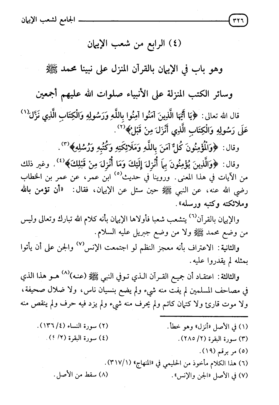 §الرَابِعُ مِنْ شُعَبِ الْإِيمَانِ، وَهُوَ بَابٌ فِي الْإِيمَانِ بِالْقُرْآنِ الْمُنَزَّلُ عَلَى نَبِيِّنَا مُحَمَّدٍ صَلَّى اللَّهُ عَلَيْهِ وَسَلَّمَ وَسَائِرِ الْكُتُبِ الْمُنَزَّلَةِ عَلَى الْأَنْبِيَاءِ صَلَوَاتُ اللهِ عَلَيْهِمْ أَجْمَعِينَ قَالَ اللهُ تَعَالَى: {يَا أَيُّهَا الَّذِينَ آمَنُوا آمِنُوا بِاللهِ وَرَسُولِهِ، وَالْكِتَابِ الَّذِي نَزَّلَ عَلَى رَسُولِهِ، وَالْكِتَابِ الَّذِي أَنْزَلَ مِنْ قَبْلُ} [النساء: 136] وَقَالَ: {وَالْمُؤْمِنُونَ كُلٌّ آمَنَ بِاللهِ وَمَلَائِكَتِهِ، وَكُتُبِهِ وَرُسُلِهِ} [البقرة: 285] وَقَالَ: {وَالَّذِينَ يُؤْمِنُونَ بِمَا أُنْزِلَ إِلَيْكَ، وَمَا أُنْزِلَ مِنْ قَبْلِكَ} [البقرة: 4] وَغَيْرِ ذَلِكَ مِنَ الْآيَاتِ فِي هَذَا الْمَعْنَى