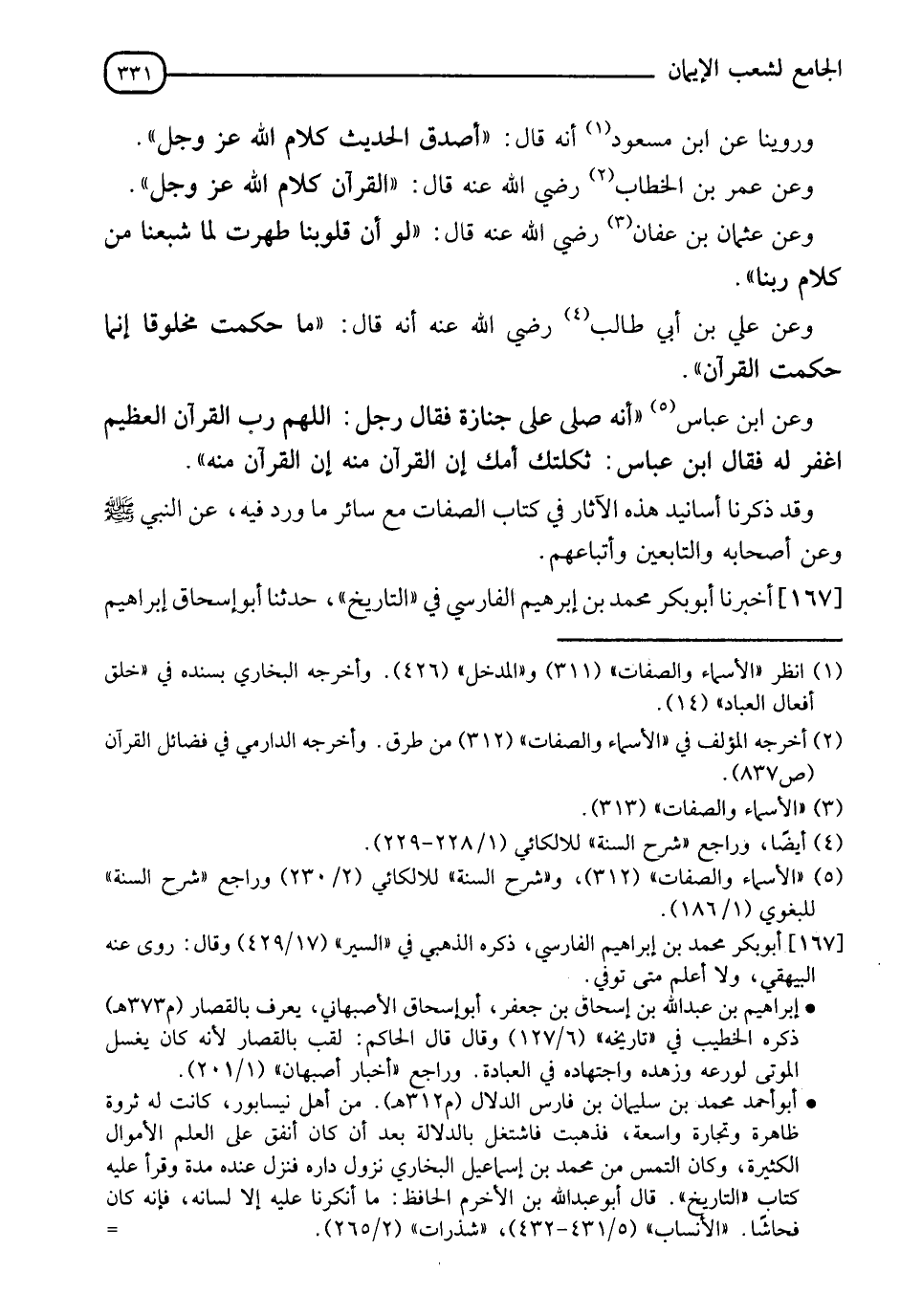 167 - أَخْبَرَنَا أَبُو بَكْرٍ مُحَمَّدُ بْنُ إِبْرَاهِيمَ الْفَارِسِيُّ فِي التَّارِيخِ، حدثنا أَبُو إِسْحَاقَ إِبْرَاهِيمُ -[332]- بْنُ عَبْدِ اللهِ الْأَصْبَهَانِيُّ، أَخْبَرَنَا أَبُو أَحْمَدَ مُحَمَّدُ بْنُ سُلَيْمَانَ بْنِ فَارِسٍ، حَدَّثَنَا مُحَمَّدُ بْنُ إِسْمَاعِيلَ الْبُخَارِيُّ قَالَ: الْحَكَمُ بْنُ مُحَمَّدٍ أَبُو مَرْوَانَ الطَّبَرِيُّ حَدَّثَنَاهُ، سَمِعَ ابْنَ عُيَيْنَةَ قَالَ: " أَدْرَكْتُ مَشْيَخَتَنَا مُنْذُ سَبْعِينَ سَنَةً مِنْهُمْ عَمْرُو بْنُ دِينَارٍ يَقُولُونَ: " §الْقُرْآنُ كَلَامُ اللهِ لَيْسَ بِمَخْلُوقٍ " كَذَا قَالَ الْبُخَارِيُّ، عَنِ الْحَكَمِ وَرَوَاهُ سَلَمَةُ بْنُ شَبِيبٍ، عَنِ الْحَكَمِ بْنِ مُحَمَّدٍ قَالَ: حَدَّثَنَا سُفْيَانُ بْنُ عُيَيْنَةَ، عَنْ عَمْرِو بْنِ دِينَارٍ قَالَ: سَمِعْتُ مَشْيَخَتَنَا مُنْذُ سَبْعِينَ يَقُولُونَ فَذَكَرَ مَعْنَى هَذِهِ الْحِكَايَةِ.
