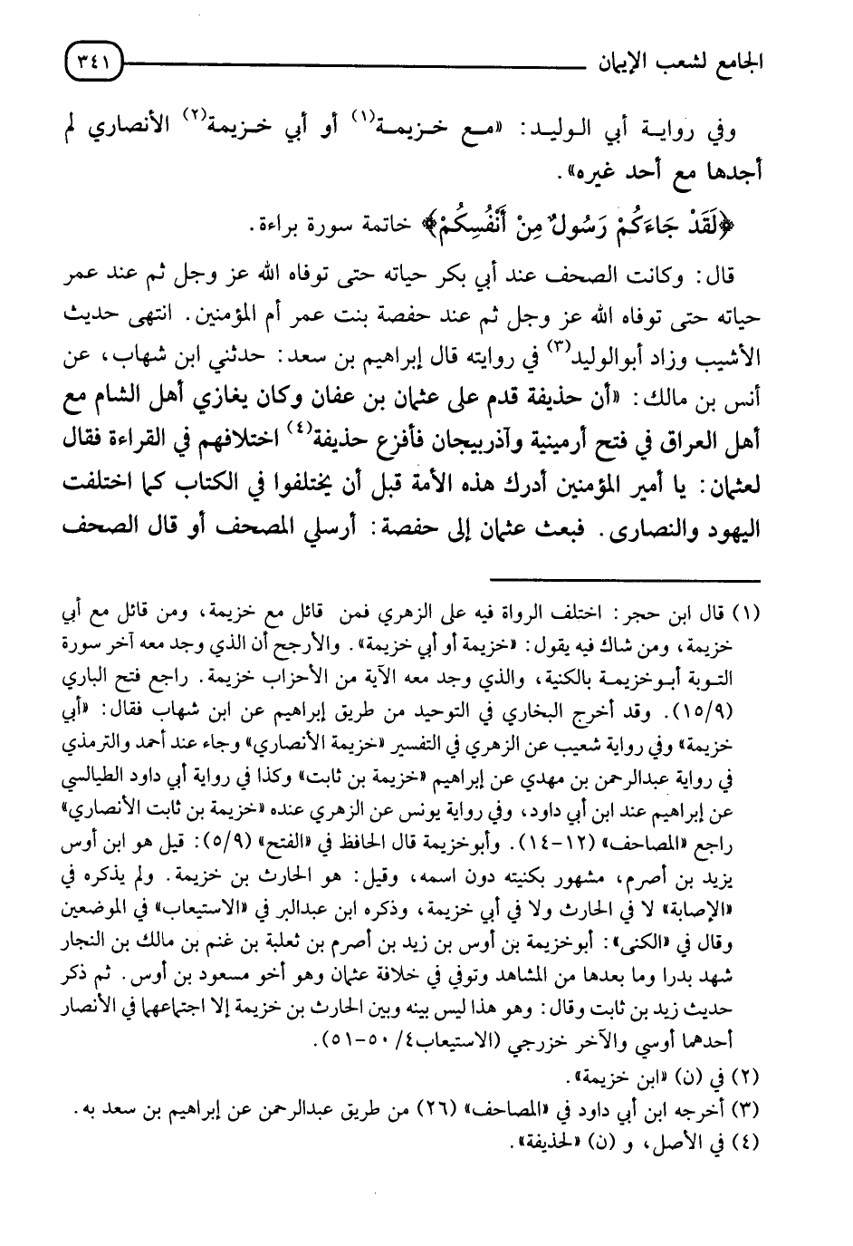 وَزَادَ أَبُو الْوَلِيدِ فِي رِوَايَتِهِ قَالَ: إِبْرَاهِيمُ بْنُ سَعْدٍ: حَدَّثَنِي ابْنُ شِهَابٍ، عَنْ أَنَسِ بْنِ مَالِكٍ، " أَنَّ §حُذَيْفَةَ قَدِمَ عَلَى عُثْمَانَ بْنِ عَفَّانَ، وَكَانَ يُغَازِي أَهْلَ الشَّامِ مَعَ أَهْلِ الْعِرَاقِ فِي فَتْحِ أَرْمِينِيَةَ وَأَذْرِبِيجَانَ، فَأَفْزَعَ حُذَيْفَةُ اخْتِلَافَهُمْ فِي الْقِرَاءَةِ، فَقَالَ لِعُثْمَانَ: يَا أَمِيرَ الْمُؤْمِنِينَ أَدْرِكْ هَذِهِ الْأُمَّةَ قَبْلَ أَنْ يَخْتَلِفُوا فِي الْكِتَابِ كَمَا اخْتَلَفَتِ الْيَهُودُ وَالنَّصَارَى، فَبَعَثَ عُثْمَانُ إِلَى حَفْصَةَ أَرْسِلِي الْمُصْحَفَ - أَوْ قَالَ الصُّحُفَ -[342]- نَنْسَخُهَا فِي الْمَصَاحِفِ - ثُمَّ نَرُدُّهَا إِلَيْكَ، فَبَعَثَتْ بِهَا إِلَيْهِ، فَدَعَا زَيْدَ بْنَ ثَابِتٍ وَأَمَرَهُ وَأَمَرَ عَبْدَ اللهِ بْنَ الزُّبَيْرِ، وَسَعِيدَ بْنَ الْعَاصِ " - وَقَالَ غَيْرُ أَبِي الْوَلِيدِ، وَعَبْدَ الرَّحْمَنِ بْنَ الْحَارِثِ بْنِ هِشَامٍ: وَأَمَرَهُمْ أَنْ يَنْسَخُوا الصُّحُفَ فِي الْمَصَاحِفِ - وَقَالَ لَهُمْ: مَا اخْتَلَفْتُمْ أَنْتُمْ وَزَيْدُ بْنُ ثَابِتٍ فِي شَيْءٍ فَاكْتُبُوهُ بِلِسَانِ قُرَيْشٍ، فَإِنَّمَا نَزَلَ بِلِسَانِهِمْ، فَكُتِبَتِ الصُّحُفَ فِي الْمَصَاحِفِ، فَبَعَثَ إِلَى كُلِّ أُفُقٍ بِمُصْحَفٍ، وَأَمَرَ بِمَا سِوَى ذَلِكَ مِنَ الْقُرْآنِ فِي كُلِّ صَحِيفَةٍ أَوْ مُصْحَفٍ أَنْ يُمْحَى، أَوْ يُحْرَقَ "