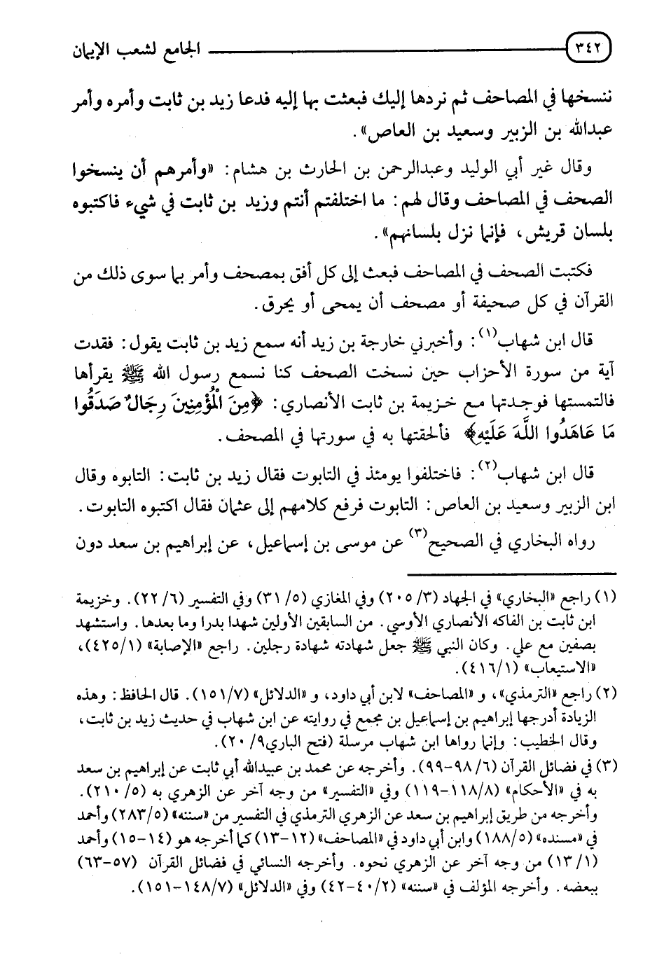قَالَ ابْنُ شِهَابٍ: وَأَخْبَرَنِي خَارِجَةُ بْنُ زَيْدٍ، أَنَّهُ سَمِعَ زَيْدَ بْنَ ثَابِتٍ يَقُولُ: " §فَقَدْتُ آيَةً مِنْ سُورَةِ الْأَحْزَابِ حِينَ نُسِخَتِ الصُّحُفُ، كُنَّا نَسْمَعُ رَسُولَ اللهِ صَلَّى اللَّهُ عَلَيْهِ وَسَلَّمَ يَقْرَأُهَا، فَالْتَمَسْتُهَا فَوَجَدْتُهَا مَعَ خُزَيْمَةَ بْنِ ثَابِتٍ الْأَنْصَارِيِّ {مِنَ الْمُؤْمِنِينَ رِجَالٌ صَدَقُوا مَا عَاهَدُوا اللهَ عَلَيْهِ} [الأحزاب: 23] فَأَلْحَقْتُهَا بِهِ فِي سُورَتِهَا فِي الْمُصْحَفِ " قَالَ ابْنُ شِهَابٍ: " فَاخْتَلَفُوا يَوْمَئِذٍ فِي التَّابُوتِ، فَقَالَ زَيْدُ بْنُ ثَابِتٍ: التَّابُوهُ، وَقَالَ ابْنُ الزُّبَيْرِ: وَسَعِيدُ بْنُ الْعَاصِ: التَّابُوتُ فَرُفِعَ كَلَامُهُمْ إِلَى عُثْمَانَ فَقَالَ: اكْتُبُوهُ التَّابُوتَ " رَوَاهُ الْبُخَارِيُّ فِي الصَّحِيحِ، عَنْ مُوسَى بْنِ إِسْمَاعِيلَ، عَنْ إِبْرَاهِيمَ بْنِ سَعْدٍ دُونَ -[343]- قَوْلِ ابْنِ شِهَابٍ قَالَ الْبَيْهَقِيُّ رَحِمَهُ اللهُ: " وَتأليفُ الْقُرْآنِ عَلَى عَهْدِ النَّبِيِّ صَلَّى اللَّهُ عَلَيْهِ وَسَلَّمَ " رُوِّينَا، عَنْ زَيْدِ بْنِ ثَابِتٍ أَنَّهُ قَالَ: " كُنَّا عِنْدَ رَسُولِ اللهِ صَلَّى اللَّهُ عَلَيْهِ وَسَلَّمَ نُؤَلِّفُ الْقُرْآنَ مِنَ الرِّقَاعِ، وَإِنَّمَا أَرَادَ - وَاللهُ تَعَالَى أَعْلَمُ - تَأْلِيفَ مَا نَزَلَ مِنَ الْآيَاتِ الْمُتَفَرِّقَةِ، فِي سُورَتِهَا وَجَمَعَهَا فِيهَا بِإِشَارَةٍ مِنَ النَّبِيِّ صَلَّى اللَّهُ عَلَيْهِ وَسَلَّمَ، ثُمَّ كَانَتْ مُثْبَتَةً فِي الصُّدُورِ مَكْتُوبَةُ فِي الرِّقَاعِ وَاللِّخَافِ، وَالْعُسُبِ، فَجُمِعَتْ مِنْهَا فِي صُحُفٍ بِإِشَارَةِ أَبِي بَكْرٍ، وَعُمَرَ وَغَيْرِهِمَا مِنَ الْمُهَاجِرِينَ وَالْأَنْصَارِ، ثُمَّ نُسِخَ مَا جُمِعَ فِي الصُّحُفِ فِي مَصَاحِفَ بِإِشَارَةِ عُثْمَانَ بْنِ عَفَّانَ عَلَى مَا رَسَمَ الْمُصْطَفَى صَلَّى اللَّهُ عَلَيْهِ وَسَلَّمَ " وَرُوِّينَا عَنْ سُوَيْدِ بْنِ غَفَلَةَ أَنَّهُ قَالَ: قَالَ عَلِيُّ بْنُ أَبِي طَالِبِ: " يَرْحَمُ اللهُ عُثْمَانَ لَوْ كُنْتُ أَنَا لَصَنَعْتُ فِي الْمَصَاحِفِ مَا صَنَعَ عُثْمَانُ " " وَقَدْ ذَكَرْنَا فِي كِتَابِ الْمَدْخَلِ، وَفِي آخِرِ كِتَابِ دَلَائِلِ النُّبُوَّةِ مَا يُقَوِّي هَذَا الْإِجْمَاعَ وَيَدُلُّ عَلَى صِحَّتِهِ وَالْحَمْدُ لِلَّهِ عَلَى حِفْظِ عِبَادِهِ وَتَرْكِهِمْ عَلَى الْوَاضِحَةِ وَفَّقَنَا لِمُتَابَعَةِ السُّنَّةِ وَمُجَانَبَةِ الْبِدْعَةِ "