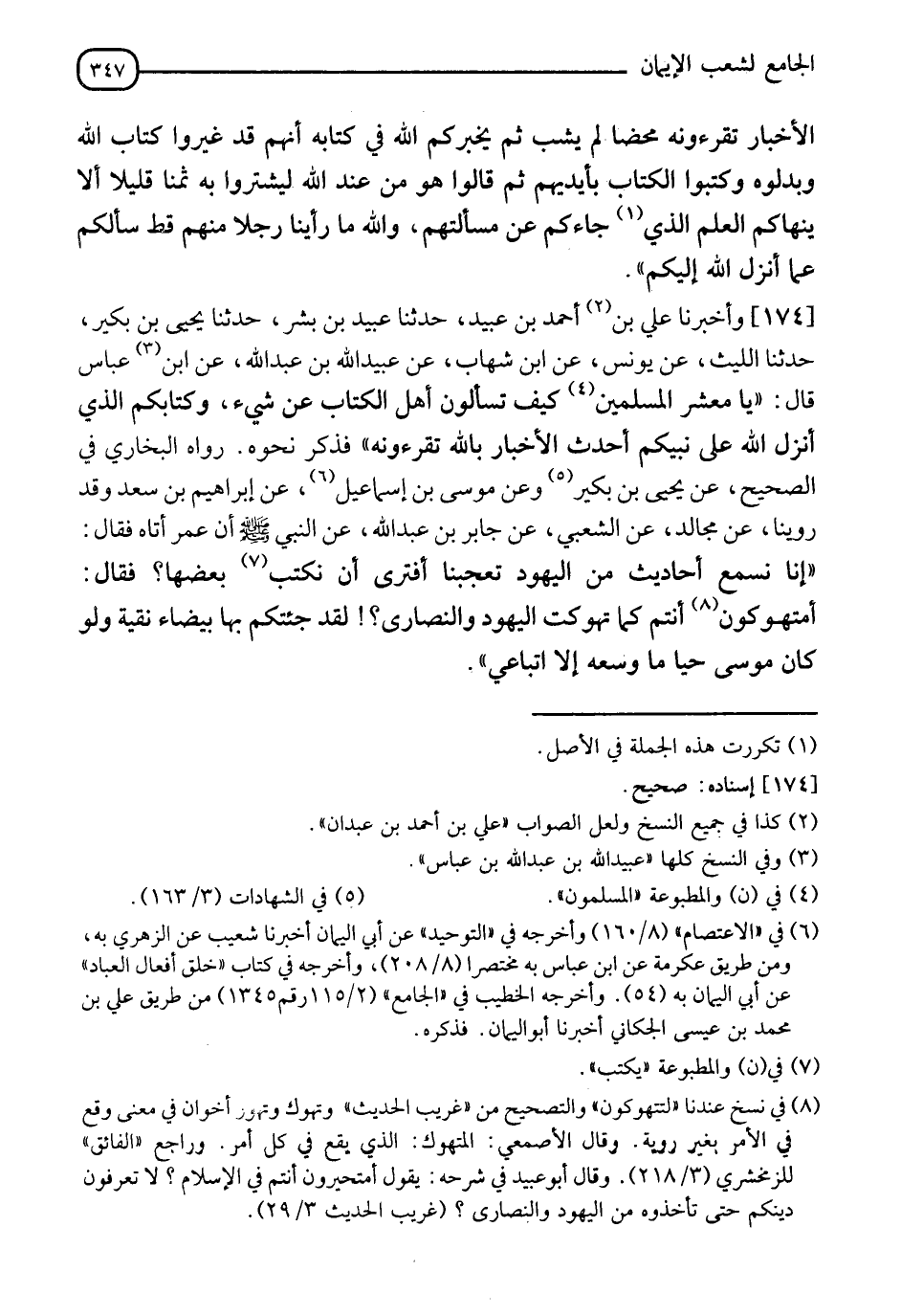 وَقَدْ رُوِّينَا عَنْ مُجَالِدٍ، عَنِ الشَّعْبِيِّ، عَنْ جَابِرِ بْنِ عَبْدِ اللهِ، عَنِ النَّبِيِّ صَلَّى اللَّهُ عَلَيْهِ وَسَلَّمَ، أَنَّ عُمَرَ أَتَاهُ فَقَالَ: إِنَّا نَسْمَعُ أَحَادِيثَ مِنَ الْيَهُودِ تُعْجِبُنَا أَفَتَرَى أَنْ نَكْتُبَ بَعْضَهَا؟ فَقَالَ: §" أَمُتَهَوِّكُونَ أَنْتُمْ كَمَا تَهَوَّكَتِ الْيَهُودُ والنَّصَارَى؟ لَقَدْ جِئْتُكُمْ بِهَا بَيْضَاءَ نَقِيَّةً، وَلَوْ كَانَ مُوسَى حَيًّا مَا وَسِعَهُ إِلَّا اتِّبَاعِي "