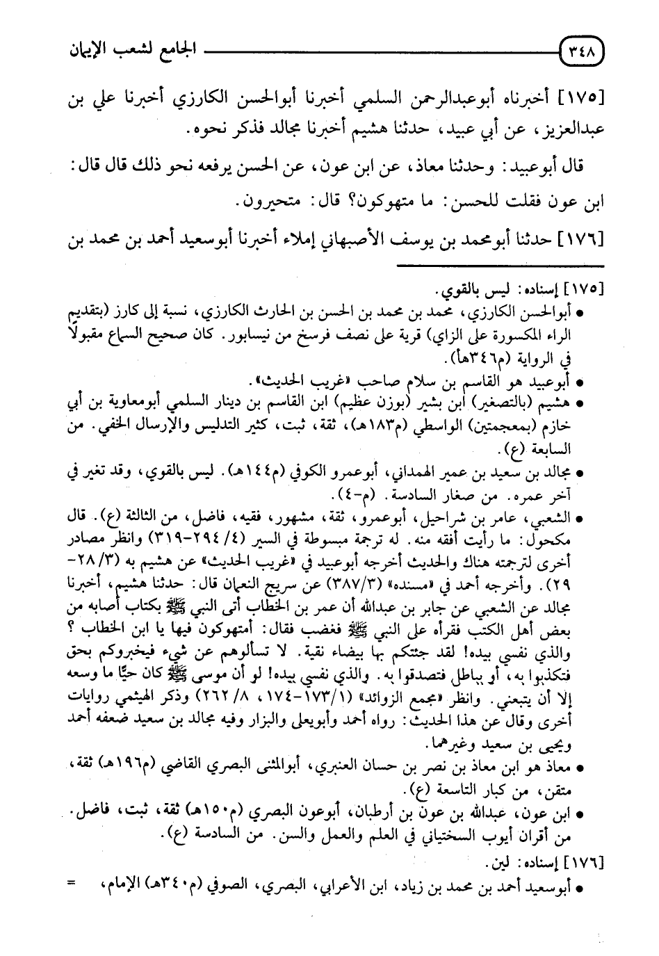 176 - حَدَّثَنَا أَبُو مُحَمَّدِ بْنُ يُوسُفَ الْأَصْبَهَانِيُّ إِمْلَاءً، أخبرنا أَبُو سَعِيدٍ أَحْمَدُ بْنُ مُحَمَّدِ بْنِ -[349]- زِيَادٍ الْبَصْرِيُّ بِمَكَّةَ، حَدَّثَنَا الْهَيْثَمُ بْنُ سَهْلٍ التُّسْتَرِيُّ، حَدَّثَنَا حَمَّادُ بْنُ زَيْدٍ، حَدَّثَنَا مُجَالِدُ بْنُ سَعِيدٍ، وَأَخْبَرَنَا أَحْمَدُ بْنُ الْحَسَنِ الْقَاضِي، حَدَّثَنَا أَبُو عَلِيٍّ حَامِدُ بْنُ مُحَمَّدٍ الرَّفَّاءُ، حَدَّثَنَا مُحَمَّدُ بْنُ شَاذَانَ الْجَوْهَرِيُّ، حَدَّثَنَا زَكَرِيَّا بْنُ عَدِيٍّ، حَدَّثَنَا حَمَّادُ بْنُ زَيْدٍ، عَنْ مُجَالِدٍ، عَنِ الشَّعْبِيِّ، عَنْ جَابِرٍ قَالَ: قَالَ رَسُولُ اللهِ صَلَّى اللَّهُ عَلَيْهِ وَسَلَّمَ: " §لَا تَسْأَلُوا أَهْلَ الْكِتَابِ عَنْ شَيْءٍ، فَإِنَّهُمْ لَنْ يَهْدُوكُمْ وَقَدْ ضَلُّوا " زَادَ الْقَاضِي فِي رِوَايَتِهِ: " وَاللهِ لَوْ كَانَ مُوسَى عَلَيْهِ السَّلَامُ حَيًّا مَا حَلَّ لَهُ إِلَّا أَنْ يَتَّبِعَنِي ". " وَرُوِيَ عَنْ جُبَيْرِ بْنِ نُفَيْرٍ، عَنْ عُمَرَ بْنِ الْخَطَّابِ، عَنِ النَّبِيِّ صَلَّى اللَّهُ عَلَيْهِ وَسَلَّمَ فِي مَحْوِ مَا كُتِبَ مِنْ قَوْلِ الْيَهُودِ بَرِيقَهُ وَالنَّهْيِ عَنْ ذَلِكَ "