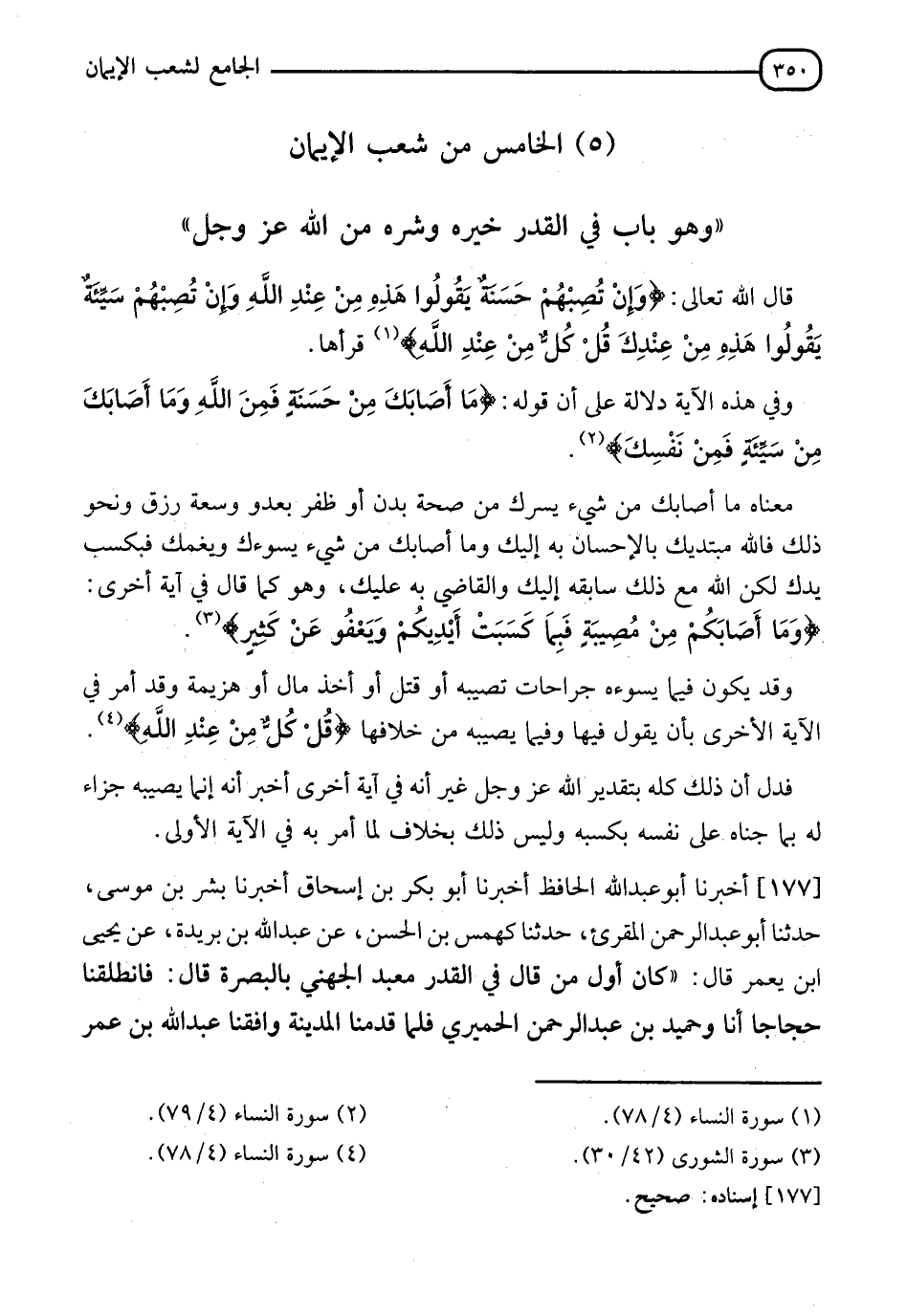 §الْخَامِسُ مِنْ شُعَبِ الْإِيمَانِ، وَهُوَ بَابٌ فِي الْقَدَرَ خَيْرَهُ وَشَرَّهُ مِنَ اللهِ عَزَّ وَجَلَّ " قَالَ اللهُ تَعَالَى: {وَإِنْ تُصِبْهُمْ حَسَنَةٌ يَقُولُوا هَذِهِ مِنْ عِنْدِ اللهِ، وَإِنْ تُصِبْهُمْ سَيِّئَةٌ يَقُولُوا هَذِهِ مِنْ عِنْدِكَ قُلْ كُلٌّ مِنْ عِنْدِ اللهِ} [النساء: 78] قَرَأَهَا وَفِي هَذِهِ الْآيَةِ دَلَالَةٌ عَلَى أَنَّ قَوْلَهُ: {مَا أَصَابَكَ مِنْ حَسَنَةٍ فَمِنَ اللهِ، وَمَا أَصَابَكَ مِنْ سَيِّئَةٍ فَمِنْ نَفْسِكَ} [النساء: 79] مَعْنَاهُ: مَا أَصَابَكَ مِنْ شَيْءٍ يَسُرُّكَ مِنْ صِحَّةِ بَدَنٍ، أَوَ ظَفَرٍ بِعَدُوٍّ وَسَعَةِ رِزْقٍ، ونحو ذَلِكَ فَاللهُ مُبْتَدِيكَ بِالْإِحْسَانِ بِهِ إِلَيْكَ، وَمَا أَصَابَكَ مِنْ شَيْءٍ يَسُوءُكَ، وَيَغُمُّكَ فَبِكَسْبِ يَدِكَ لَكِنَّ اللهَ مَعَ ذَلِكَ سَائِقهُ إِلَيْكَ وَالْقَاضِي بِهِ عَلَيْكَ، وَهُوَ كَمَا قَالَ: فِي آيَةٍ أُخْرَى وَمَا أَصَابَكُمْ مِنْ مُصِيبَةٍ، فَبِمَا كَسَبَتْ أَيْدِيكُمْ، وَيَعْفُو عَنْ كَثِيرٍ وَقَدْ يَكُونُ فِيمَا يَسُوءُهُ جِرَاحَاتٌ تُصِيبُهُ، أَوْ قَتْلٌ أَوْ أَخَذُ مَالٍ، أَوْ هَزِيمَةٌ وَقَدْ أَمَرَ فِي الْآيَةِ الْأُخْرَى بِأَنْ يَقُولَ: فِيهَا وَفِيمَا يُصِيبُهُ مِنْ خِلَافَهَا: {قُلْ كُلٌّ مِنْ عِنْدِ اللهِ} [النساء: 78] فَدُلَّ أَنَّ ذَلِكَ كُلَّهُ بِتَقْدِيرِ اللهِ عَزَّ وَجَلَّ غَيْرَ أَنَّهُ فِي آيَةٍ أُخْرَى أَخْبَرَ أَنَّهُ إِنَّمَا يُصِيبُهُ جَزَاءً لَهُ بِمَا جَنَاهُ عَلَى نَفْسِهِ بِكَسْبِهِ، وَلَيْسَ ذَلِكَ بِخِلَافِ لِمَا أَمَرَ بِهِ فِي الْآيَةِ الْأُولَى "