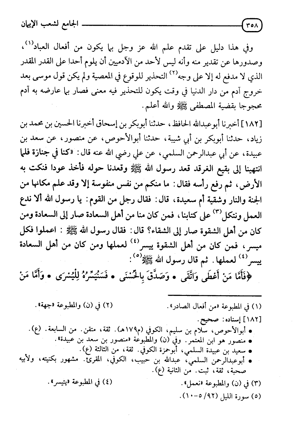 182 - أَخْبَرَنَا أَبُو عَبْدِ اللهِ الْحَافِظُ، حدثنا أَبُو بَكْرِ بْنُ إِسْحَاقَ، أخبرنا الْحُسَيْنُ بْنُ مُحَمَّدِ بْنِ زِيَادٍ، حدثنا أَبُو بَكْرِ بْنُ أَبِي شَيْبَةَ، حدثنا أَبُو الْأَحْوَصِ، عَنْ مَنْصُورٍ، عَنْ سَعْدِ بْنِ عُبَيْدَةَ، عَنْ أَبِي عَبْدِ الرَّحْمَنِ السُّلَمِيِّ، عَنْ عَلِيٍّ رَضِيَ اللهُ عَنْهُ قَالَ: كُنَّا فِي جَنَازَةٍ، فَلَمَّا انْتَهَيْنَا إِلَى بَقِيعِ الْغَرْقَدِ قَعَدَ رَسُولُ اللهِ صَلَّى اللَّهُ عَلَيْهِ وَسَلَّمَ وَقَعَدْنَا حَوْلَهُ، فَأَخَذَ عُودًا فَنَكَتَ بِهِ الْأَرْضَ، ثُمَّ رَفَعَ رَأْسَهُ فَقَالَ: " مَا مِنْكُمْ مِنْ نَفْسٍ مَنْفُوسَةٍ إِلَّا وَقَدْ عُلِمَ مَكَانُهَا مِنَ الْجَنَّةِ وَالنَّارِ، وَشَقِيَّةٌ أَمْ سَعِيدَةٌ؟ " قَالَ: فَقَالَ رَجُلٌ مِنَ الْقَوْمِ: يَا رَسُولَ اللهِ، أَلَا نَدَعُ الْعَمَلَ، وَنَتَّكِلُ عَنْ كِتَابِنَا، فَمَنْ كَانَ مِنَّا مِنْ أَهْلِ السَّعَادَةِ صَارَ إِلَى السَّعَادَةِ، وَمَنْ كَانَ مِنْ أَهْلِ الشِّقْوَةِ صَارَ إِلَى الشَّقَاءِ. قَالَ: فَقَالَ رَسُولُ اللهِ صَلَّى اللَّهُ عَلَيْهِ وَسَلَّمَ: " §اعْمَلُوا فَكُلٌّ مُيَسَّرٌ، فَمَنْ كَانَ مِنْ أَهْلِ الشِّقْوَةِ يُيَسَّرُ لِعَمَلِهَا، وَمَنْ كَانَ مِنْ أَهْلِ السَّعَادَةِ يُيَسَّرُ لِعَمَلِهَا "، ثُمَّ قَالَ رَسُولُ اللهِ صَلَّى اللَّهُ عَلَيْهِ وَسَلَّمَ: {فَأَمَّا مَنْ أَعْطَى وَاتَّقَى، وَصَدَّقَ بِالْحُسْنَى فَسَنُيَسِّرُهُ لِلْيُسْرَى، وَأَمَّا -[359]- مَنْ بَخِلَ وَاسْتَغْنَى، وَكَذَّبَ بِالْحُسْنَى فَسَنُيَسِّرُهُ لِلْعُسْرَى} [الليل: 6] رَوَاهُ مُسْلِمٌ، عَنْ أَبِي بَكْرِ بْنِ أَبِي شَيْبَةَ وَأَخْرَجَهُ مِنْ حَدِيثِ جَرِيرِ بْنِ عَبْدِ الْحَمِيدِ، عَنْ مَنْصُورٍ، وَمِنْ حَدِيثِ الْأَعْمَشِ، عَنْ سَعْدٍ