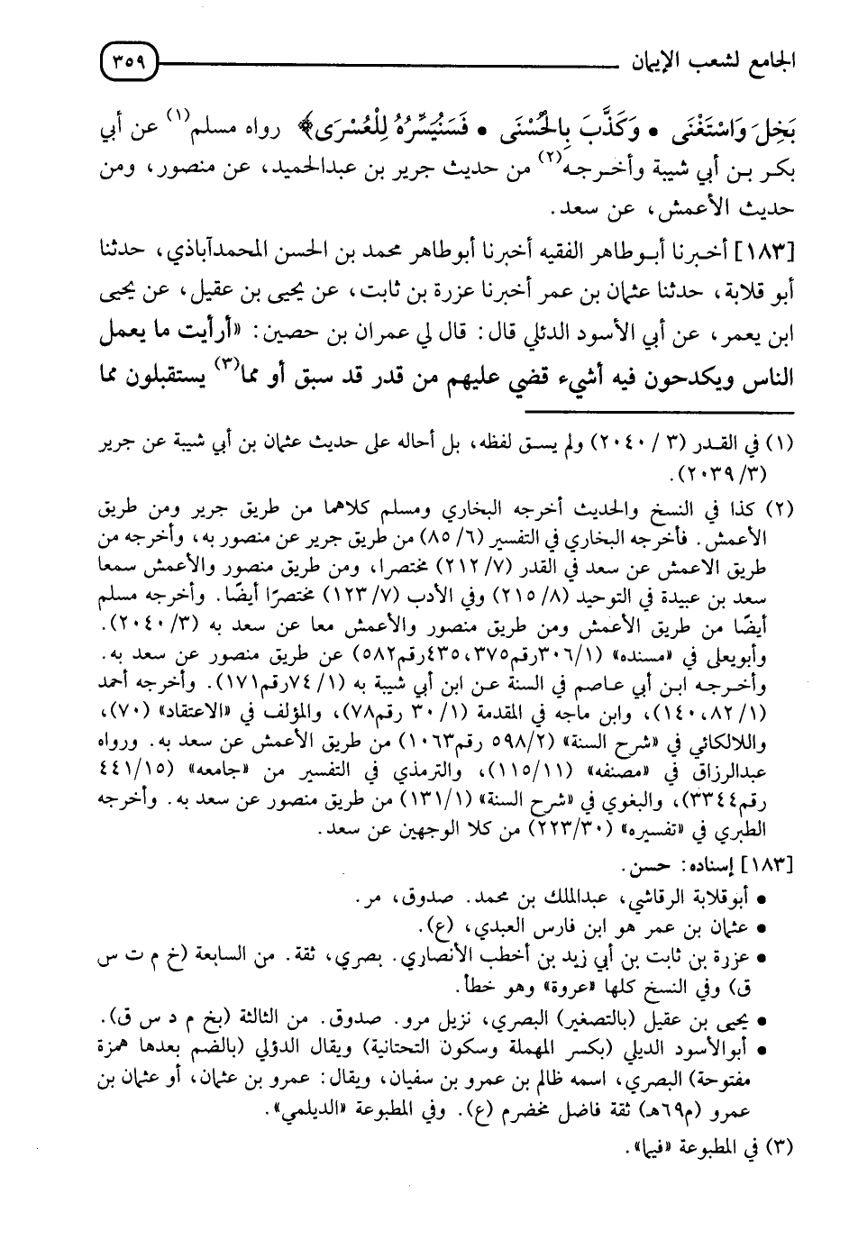 183 - أَخْبَرَنَا أَبُو طَاهِرٍ الْفَقِيهُ، أخبرنا أَبُو طَاهِرٍ مُحَمَّدُ بْنُ الْحَسَنِ الْمُحَمَّدَآبَاذِيُّ، حدثنا أَبُو قِلَابَةَ، حدثنا عُثْمَانُ بْنُ عُمَرَ، أخبرنا عَزَرَةُ بْنُ ثَابِتٍ، عَنْ يَحْيَى بْنِ عُقَيْلٍ، عَنْ يَحْيَى بْنِ يَعْمَرَ، عَنْ أَبِي الْأَسْوَدِ الدُّؤَلِيِّ قَالَ: قَالَ لِي عِمْرَانُ بْنُ حُصَيْنٍ: أَرَأَيْتَ مَا يَعْمَلُ النَّاسُ وَيَكْدَحُونَ فِيهِ؟ أَشَيْءٌ قُضِيَ عَلَيْهِمْ مِنْ قَدَرٍ قَدْ سَبَقَ؟ أَوْ مِمَّا يَسْتَقْبِلُونَ بِهِ مِمَّا -[360]- آتَاهُمْ بِهِ نَبِيُّهُمْ، وَثَبَتَتْ عَلَيْهِمْ بِهِ الْحُجَّةُ؟ قُلت: لَا بَلْ شَيْءٌ قُضِيَ عَلَيْهِمْ. قَالَ: فَهَلْ يَكُونُ ذَلِكَ ظُلْمًا؟ قَالَ: فَفَزِعْتُ مِنْ ذَلِكَ فَزَعًا شَدِيدًا، وَقُلْتُ: لَيْسَ شَيْئًا إِلَّا وَهُوَ خَلْقُ اللهِ، وَمُلْكُهُ لَا يُسْأَلُ عَمَّا يَفْعَلُ، وَهُمْ يُسْأَلُونَ قَالَ: فَقَالَ لِي: يَرْحَمُكَ اللهُ إِنِّي وَاللهِ مَا سَأَلْتُكَ إِلَّا لِأُحْرِزَ عَقْلَكَ، إِنَّ رَجُلَيْنِ - أَوْ قَالَ: رَجُلٌ - مِنْ مُزَيْنَةَ أَتَى النَّبِيَّ صَلَّى اللَّهُ عَلَيْهِ وَسَلَّمَ فَقَالَ: أَرَأَيْتَ مَا يَعْمَلُونَ، وَيَكْدَحُ النَّاسُ فِيهِ الْيَوْمَ، فِيهِ شَيْءٌ قُضي عَلَيْهِمْ وَمَضَى عَلَيْهِمْ مِنْ قَدَرٍ قَدْ سَبَقَ، أَوْ فِيمَا يَسْتَقْبِلُونَ مِمَّا أَتَاهُمْ بِهِ نَبِيُّهُمْ، وَاتُّخِذَتْ عَلَيْهِمْ بِهِ الْحُجَّةُ؟ قَالَ: " لَا بَلْ شَيْءٌ قُضيَ عَلَيْهِمْ وَمَضَى عَلَيْهِمْ ". قَالَ: §وَفِيمَا نَعْمَلُ إِذًا؟ قَالَ: " مَنْ كَانَ خَلَقَهُ اللهُ لِوَاحِدَةٍ مِنَ الْمَنْزِلَتَيْنِ فَيُيَسِّرُهُ لَهَا، وَتَصْدِيقُ ذَلِكَ فِي كِتَابِ اللهِ عَزَّ وَجَلَّ: {وَنَفَسٌ وَمَا سَوَّاهَا فَأَلْهَمَهَا فُجُورَهَا وَتَقْوَاهَا} [الشمس: 8] رَوَاهُ مُسْلِمُ فِي الصَّحِيحِ، عَنْ إِسْحَاقَ بْنِ إِبْرَاهِيمَ، عَنْ عُثْمَانَ بْنِ عُمَرَ " وَفِي هَذَا وَالَّذِي قَبْلَهُ دَلَالَةٌ عَلَى أَنَّ الْعَبْدَ إِنَّمَا يُيَسَّرُ لِمَا خُلِقَ لَهُ، وَأَنَّ التَّيْسِيرَ إِنَّمَا هُوَ بِحَقِّ الْمُلْكِ، وَلَا يُسْأَلُ عَمَّا يَفْعَلُ، وَهُمْ يُسْأَلُونَ وَيُشْبِهُ أَنْ يَكُونُوا إِنَّمَا تَعَبَّدُوا بِهَذَا النَّوْعِ مِنَ التَّعَبُّدِ لِيَتَعَلَّقَ خَوْفُهُمْ بِالْبَاطِنِ الْمُغَيَّبِ عَنْهُمْ، فَلَا يَتَّكِلُوا عَلَى مَا يَظْهَرُ مِنْ أَعْمَالِهِمْ، وَرَجَاءهِمْ بِالظَّاهِرِ الْبَادِي لَهُمْ فَيَرْجُوا بِهِ حُسْنَ أَحْوَالِهِمْ وَالْخَوْفُ، وَالرَّجَاءُ مَدْرَجَا -[361]- الْعُبُودِيَّةِ فَيَسْتَكْمِلُوا بِذَلِكَ صِفَةَ الْإِيمَانِ، وَفِي مِثْلِ هَذَا الْمَعْنَى حَدِيثُ عَبْدِ اللهِ بْنِ مَسْعُودٍ، عَنِ النَّبِيِّ صَلَّى اللَّهُ عَلَيْهِ وَسَلَّمَ "