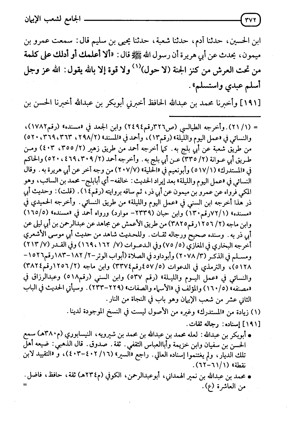191 - وَأَخْبَرَنَا مُحَمَّدُ بْنُ عَبْدِ اللهِ الْحَافِظُ، أَخْبَرَنِي أَبُو بَكْرِ بْنُ عَبْدِ اللهِ، أخبرنا الْحَسَنُ بْنُ -[373]- سُفْيَانَ، حدثنا مُحَمَّدُ بْنُ عَبْدِ اللهِ بْنِ نُمَيْرٍ، حدثنا عَبْدُ اللهِ بْنُ إِدْرِيسَ، عَنْ رَبِيعَةَ بْنِ عُثْمَانَ، عَنْ مُحَمَّدِ بْنِ يَحْيَى بْنِ حَبَّانَ، عَنِ الْأَعْرَجِ، عَنْ أَبِي هُرَيْرَةَ قَالَ: قَالَ رَسُولُ اللهِ صَلَّى اللَّهُ عَلَيْهِ وَسَلَّمَ: §" الْمُؤْمِنُ الْقَوِيُّ خَيْرٌ وَأَحَبُّ إِلَى اللهِ مِنَ الْمُؤْمِنِ الضَّعِيفِ وَفِي كُلٍّ خَيْرٌ، احْرِصْ عَلَى مَا يَنْفَعُكَ وَاسْتَعِنْ بِاللهِ وَلَا تَعْجَزْ، وَإِنْ أَصَابَكَ شَرٌّ فَلَا تَقُلْ لَوْ أَنِّي فَعَلْتُ كَذَا وَكَذَا قُلْ قَدَّرَ اللهُ وَمَا شَاءَ اللهُ فَعَلَ، فَإِنَّ لَوْ تَفْتَحُ عَمَلَ الشَّيْطَانِ " رَوَاهُ مُسْلِمٌ فِي الصَّحِيحِ، عَنِ ابْنِ نُمَيْرٍ