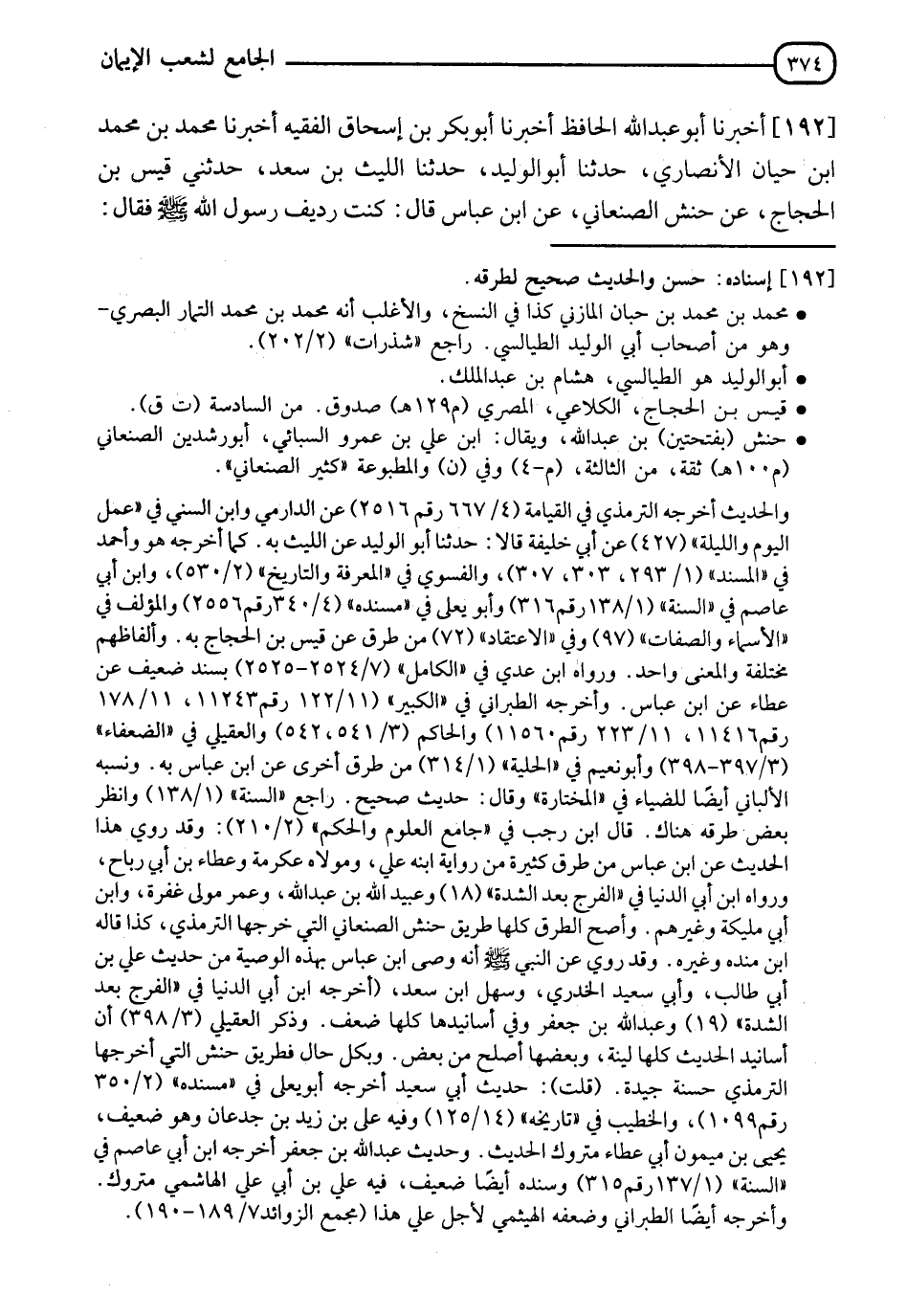 192 - أَخْبَرَنَا أَبُو عَبْدِ اللهِ الْحَافِظُ، أخبرنا أَبُو بَكْرِ بْنُ إِسْحَاقَ الْفَقِيهُ، أخبرنا مُحَمَّدُ بْنُ مُحَمَّدِ بْنِ حَيَّانَ الْأَنْصَارِيُّ، حدثنا أَبُو الْوَلِيدِ، حدثنا اللَّيْثُ بْنُ سَعْدٍ، حَدَّثَنِي قَيْسُ بْنُ الْحَجَّاجِ، عَنْ حَنَشٍ الصَّنْعَانِيِّ، عَنِ ابْنِ عَبَّاسٍ قَالَ: كُنْتُ رَدِيفَ رَسُولِ اللهِ صَلَّى اللَّهُ عَلَيْهِ وَسَلَّمَ، فَقَالَ: " -[375]- يَا غُلَامُ أَوْ يَا غُلَيِّمُ، §احْفَظِ اللهَ يَحْفَظْكَ احْفَظِ اللهَ تَجِدْهُ تُجَاهَكَ، وَإِذَا سَأَلْتَ فَاسْأَلِ اللهَ، وَإِذَا اسْتَعَنْتَ فَاسْتَعِنْ بِاللهِ، وَاعْلَمْ أَنَّ الْأُمَّةَ لَوِ اجْتَمَعَتْ عَلَى أَنْ يَنْفَعُوكَ بِشَيْءٍ، لَمْ يَكْتُبْهُ اللهُ لَكَ لَمْ يَقْدِرُوا عَلَى ذَلِكَ، وَلَوِ اجْتَمَعُوا عَلَى أَنْ يَضُرُّوكَ بِشَيْءٍ، لَمْ يَكْتُبْهُ اللهُ عَلَيْكَ لَمْ يَقْدِرُوا عَلَى ذَلِكَ، قُضِيَ الْقَضَاءُ وَجَفَّتِ الْأَقْلَامُ، وَطُوِيَتِ الصُّحُفُ " وَرُوِّينَا فِي دُعَاءِ النَّبِيِّ صَلَّى اللَّهُ عَلَيْهِ وَسَلَّمَ: " اللهُمَّ إِنِّي أَسْأَلُكَ الصِّحَّةَ، وَالْعِفَّةَ، وَالْأَمَانَةَ وَحُسْنَ الْخُلُقِ، وَالرِّضَا بِالْقَدَرِ "، وَفِي حَدِيثٍ آخَرَ: " وَأَسْأَلُكَ الرِّضَا بَعْدَ الْقَضَاءِ "