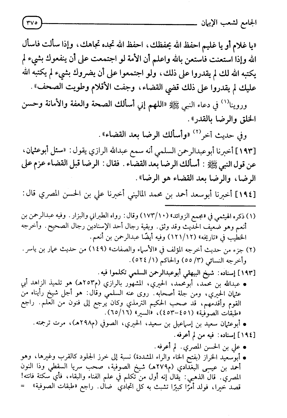 193 - أَخْبَرَنَا أَبُو عَبْدِ الرَّحْمَنِ السُّلَمِيُّ، أَنَّهُ سَمِعَ عَبْدَ اللهِ الرَّازِيَّ يَقُولُ: سُئِلَ أَبُو عُثْمَانَ عَنْ قَوْلِ النَّبِيِّ صَلَّى اللَّهُ عَلَيْهِ وَسَلَّمَ: أَسْأَلُكَ الرِّضَا بَعْدَ الْقَضَاءِ فَقَالَ: " §الرِّضَا قَبْلَ الْقَضَاءِ عَزْمٌ عَلَى الرِّضَا، وَالرِّضَا بَعْدَ الْقَضَاءِ هُوَ الرِّضَا "