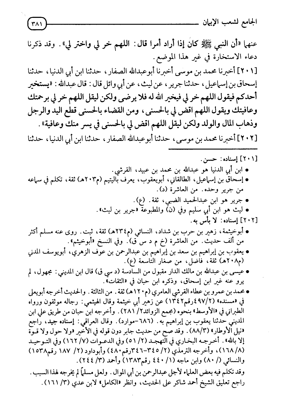 201 - أَخْبَرَنَا مُحَمَّدُ بْنُ مُوسَى، أخبرنا أَبُو عَبْدِ اللهِ الصَّفَّارُ، حدثنا ابْنُ أَبِي الدُّنْيَا، حدثنا إِسْحَاقُ بْنُ إِسْمَاعِيلَ، حدثنا جَرِيرٌ، عَنْ لَيْثٍ، عَنْ أَبِي وَائِلٍ قَالَ: قَالَ عَبْدُ اللهِ: " §يَسٍتَخِيرُ أَحَدُكُمْ فَيَقُولُ: اللهُمَّ خِرْ لِي، فَيُخَيَّرُ اللهُ لَهُ فَلَا يَرْضَى، وَلَكِنْ لِيَقُلِ اللهُمَّ خِرْ لِي بِرَحْمَتِكَ وَعَافِيَتِكَ، وَيَقُولُ: اللهُمَّ اقْضِ لِي بِالْحُسْنَى، وَمِنَ الْقَضَاءِ بِالْحُسْنَى قَطْعُ الْيَدِ وَالرِّجْلِ، وَذَهَابُ الْمَالِ وَالْوَلَدِ، وَلَكِنْ لِيَقُلِ اللهُمَّ اقْضِ لِي بِالْحُسْنَى فِي يُسْرٍ مِنْكَ وَعَافِيَةٍ "