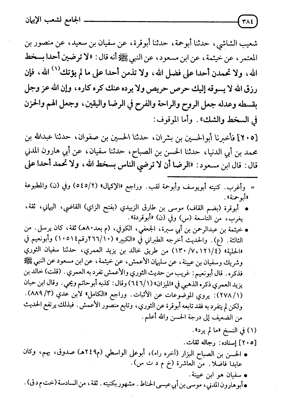 205 - فَأَخْبَرَنَا أَبُو الْحُسَيْنِ بْنُ بِشْرَانَ، حدثنا الْحُسَيْنُ بْنُ صَفْوَانَ، حدثنا عَبْدُ اللهِ بْنُ مُحَمَّدِ بْنِ أَبِي الدُّنْيَا، حدثنا الْحَسَنُ بْنُ الصَّبَّاحِ، حدثنا سُفْيَانُ، عَنْ أَبِي هَارُونَ الْمَدَنِيِّ قَالَ: قَالَ ابْنُ مَسْعُودٍ: " §الرِّضَا أَنْ لَا تُرْضِيَ النَّاسَ بِسَخَطِ اللهِ، وَلَا تَحْمَدَ أَحَدًا عَلَى -[385]- رِزْقِ اللهِ، وَلَا تَلُمْ أَحَدًا عَلَى مَا لَمْ يُؤْتِكَ اللهُ، فَإِنَّ الرِّزْقَ لَا يَسُوقُهُ حِرْصُ حَرِيصٍ، وَلَا يَرُدُّهُ كَرَاهِيَةُ كَارِهٍ، وَاللهُ بِقِسْطِهِ وَعِلْمِهِ جَعَلَ الرَّوْحَ وَالْفَرَحَ فِي الْيَقِينِ وَالرِّضَا، وَجَعَلَ الْهَمَّ وَالْحُزْنَ فِي الشَّكِّ وَالسَّخَطِ "