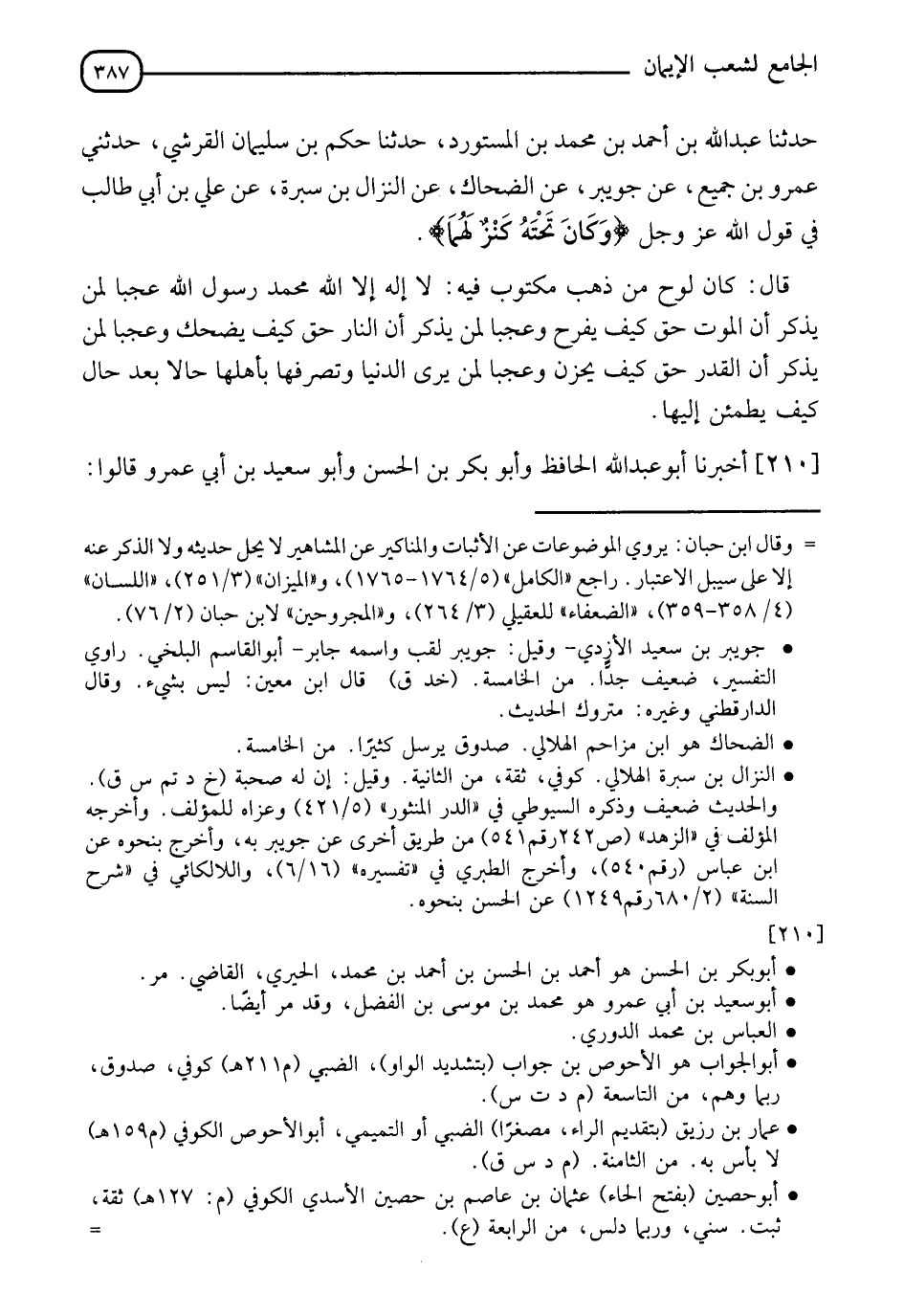 210 - أَخْبَرَنَا أَبُو عَبْدِ اللهِ الْحَافِظُ، وَأَبُو بَكْرِ بْنُ الْحَسَنِ، وَأَبُوسَعِيدِ بْنُ أَبِي عَمْرٍو قَالُوا: -[388]- حدثنا أَبُو الْعَبَّاسِ مُحَمَّدُ بْنُ يَعْقُوبَ، حدثنا الْعَبَّاسُ بْنُ مُحَمَّدٍ، حدثنا أَبُو الْجَوَّابِ، حدثنا عَمَّارُ بْنُ رُزَيْقٍ، عَنْ أَبِي حُصَيْنِ، عَنْ يَحْيَى بْنِ وَثَّابٍ، عَنْ مَسْرُوقٍ قَالَ: قَالَ عَبْدُ اللهِ: " §لَا يُؤْمِنُ الْعَبْدُ حَتَّى يُؤْمِنَ بِالْقَدَرِ، يَعْلَمُ أَنَّ مَا أَصَابَهُ لَمْ يَكُنْ لِيُخْطِئَهُ، وَمَا أَخْطَأَهُ لَمْ يَكُنْ لِيُصِيبَهُ، وَلَأَنْ أَعَضُّ عَلَى جَمْرَةٍ حَتَّى تُطْفَأَ، أَحَبُّ إِلَيَّ مِنْ أَنْ أَقُولَ لِأَمْرٍ قضاه اللهُ لَيْتَهُ لَمْ يَكُنْ "