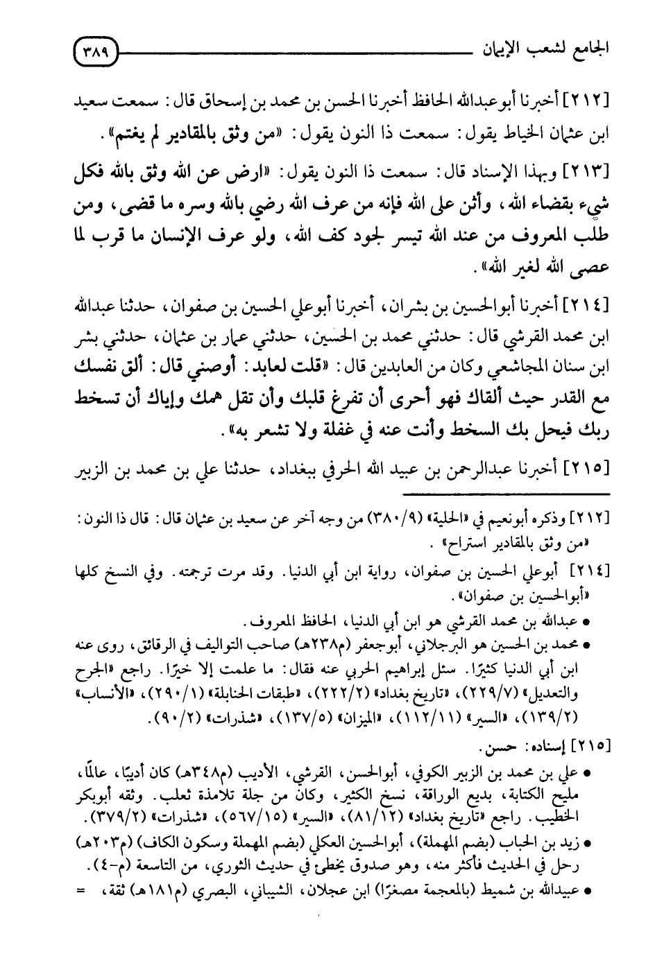 213 - وَبِهَذَا الْإِسْنَادِ قَالَ: سَمِعْتُ ذَا النُّونِ يَقُولُ: " §ارْضَ عَنِ اللهِ، وَثِقْ بِاللهِ فَكُلُّ شَيْءٍ بِقَضَاءِ اللهِ، وَأَثْنِ عَلَى اللهِ فَإِنَّهُ مَنْ عَرَفَ اللهَ رَضِيَ بِاللهِ وَسَرَّهُ مَا قَضَى، وَمَنْ طَلَبَ الْمَعْرُوفَ مِنْ عِنْدِ اللهِ تَيَسَّرَ لِجُودِ كَفِّ اللهِ، وَلو عَرَفَ الْإِنْسَانُ مَا قَرُبَ لِمَا عَصَى اللهَ لِغَيْرِ اللهِ "
