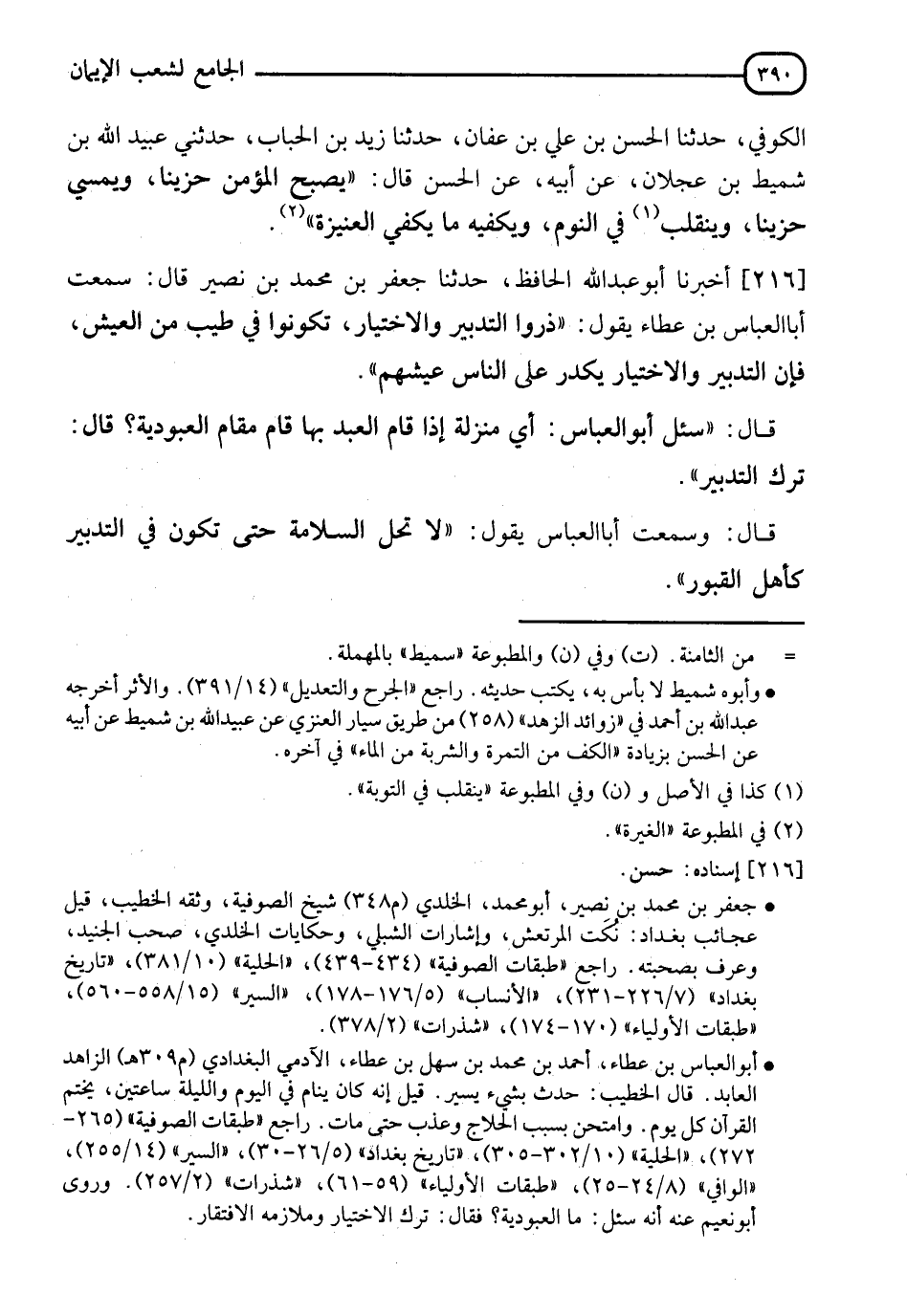 216 - أَخْبَرَنَا أَبُو عَبْدِ اللهِ الْحَافِظُ، حدثنا جَعْفَرُ بْنُ مُحَمَّدِ بْنِ نُصَيْرٍ قَالَ: سَمِعْتُ أَبَا الْعَبَّاسِ بْنَ عَطَاءٍ يَقُولُ: " §ذَرُوا التَّدْبِيرَ وَالِاخْتِيَارَ تَكُونُوا فِي طِيبٍ مِنَ الْعَيْشِ، فَإِنَّ التَّدْبِيرِ وَالِاخْتِيَارَ يُكَدِّرُ عَلَى النَّاسِ عَيْشَهُمْ " قَالَ: سُئِلَ أَبُو الْعَبَّاسِ: أَيُّ مَنْزِلَةٍ إِذَا قَامَ الْعَبْدُ بِهَا قَامَ مَقَامَ الْعُبُودِيَّةِ؟ قَالَ: " تَرْكُ التَّدْبِيرِ " قَالَ: وَسَمِعْتُ أَبَا الْعَبَّاسِ يَقُولُ: " لَا تَحِلُّ السَّلَامَةُ حَتَّى تَكُونَ فِي التَّدْبِيرِ كَأَهْلِ الْقُبُورِ " -[391]- قَالَ: وَسَمِعْتُ أَبَا الْعَبَّاسِ يَقُولُ: " الْفَرَحِ فِي تَدْبِيرِ اللهِ تَعَالَى لَنَا، وَالشَّقَاءُ فِي تَدْبِيرِنَا "