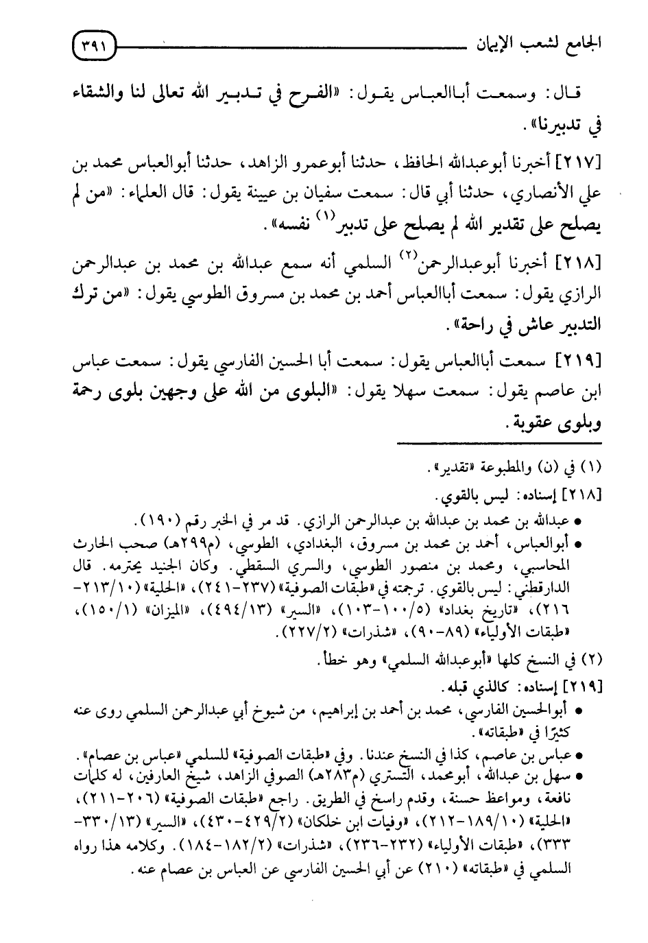 218 - أَخْبَرَنَا أَبُو عَبْدِ الرَّحْمَنِ السُّلَمِيُّ، أَنَّهُ سَمِعَ عَبْدَ اللهِ بْنَ مُحَمَّدِ بْنِ عَبْدِ الرَّحْمَنِ الرَّازِيَّ يَقُولُ: سَمِعْتُ أَبَا الْعَبَّاسِ أَحْمَدَ بْنَ مُحَمَّدِ بْنِ مَسْرُوقٍ الطُّوسِيَّ يَقُولُ: §" مَنْ تَرَكَ التَّدْبِيرِ عَاشَ فِي رَاحَةٍ "