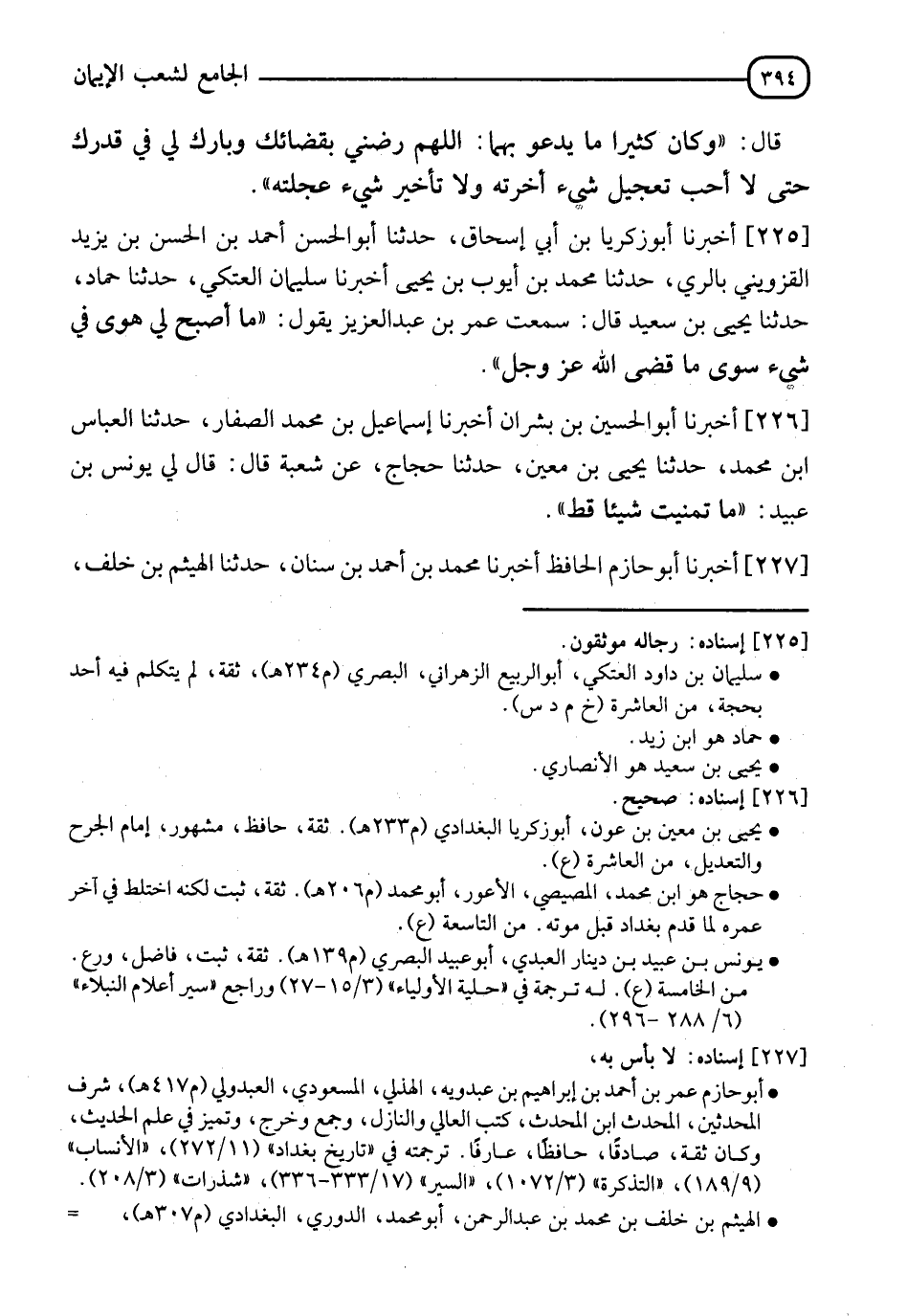 225 - أَخْبَرَنَا أَبُو زَكَرِيَّا بْنُ إِسْحَاقَ، حدثنا أَبُو الْحَسَنِ أَحْمَدُ بْنُ الْحَسَنِ بْنِ يَزِيدَ الْقَزْوِينِيُّ بِالرِّيِّ، حدثنا مُحَمَّدُ بْنُ أَيُّوبَ بْنِ يَحْيَى، أخبرنا سُلَيْمَانُ الْعَتَكِيُّ، حدثنا حَمَّادٌ، حَدَّثَنَا يَحْيَى بْنُ سَعِيدٍ قَالَ: سَمِعْتُ عُمَرَ بْنَ عَبْدِ الْعَزِيزِ يَقُولُ: §" مَا أَصْبَحَ لِي هَوًى فِي شَيْءٍ سِوَى مَا قَضَى الله عَزَّ وَجَلَّ "