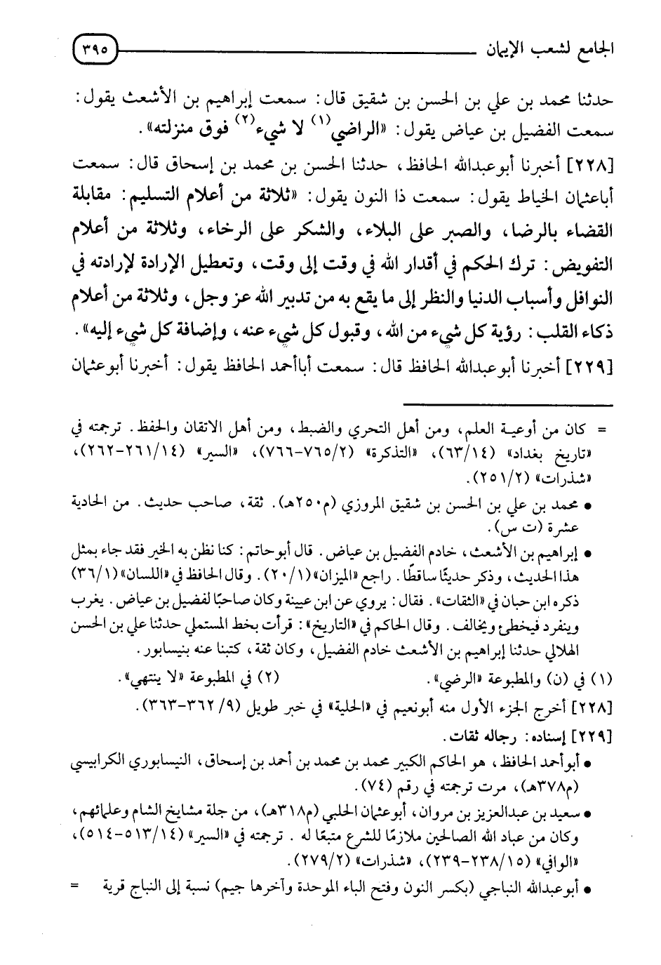 229 - أَخْبَرَنَا أَبُو عَبْدِ اللهِ الْحَافِظُ قَالَ: سَمِعْتُ أَبَا أَحْمَدَ الْحَافِظَ يَقُولُ: أخبرنا أَبُو عُثْمَانَ -[396]- سَعِيدُ بْنُ عَبْدِ الْعَزِيزِ الْحَلَبِيُّ، حدثنا أَحْمَدُ بْنُ أَبِي الْحَوَارِيِّ قَالَ: سَمِعْتُ أَبَا عَبْدِ اللهِ النِّبَاجِيَّ يَقُولُ: " §أَجَلُّ الْعِبَادَةِ عِنْدِي ثَلَاثَةٌ: لَا تَرُدَّ مِنْ أَحْكَامِهِ شَيْئًا، وَلَا تَسْأَلْ غَيْرَهُ حَاجَةً، وَلَا تَدَّخِرْ عَنْهُ شَيْئًا "