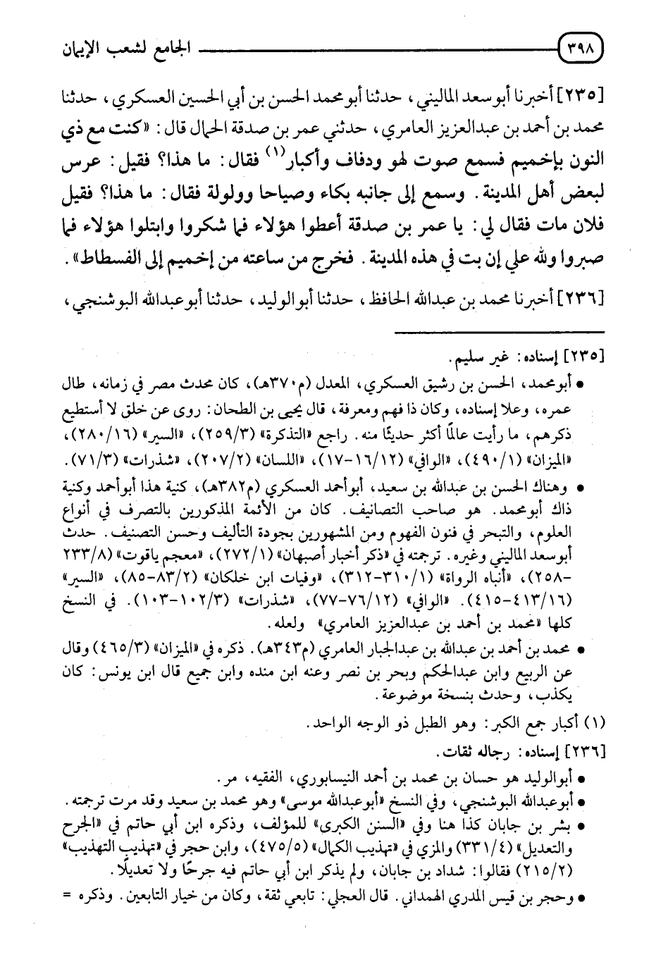 235 - أَخْبَرَنَا أَبُو سَعْدٍ الْمَالِينِيُّ، حدثنا أَبُو مُحَمَّدٍ الْحَسَنُ بْنُ أَبِي الْحُسَيْنِ الْعَسْكَرِيُّ، حدثنا مُحَمَّدُ بْنُ أَحْمَدَ بْنِ عَبْدِ الْعَزِيزِ الْعَامِرِيُّ، حَدَّثَنِي عُمَرُ بْنُ صَدَقَةَ الْحَمَّالُ قَالَ: كُنْتُ مَعَ ذِي النُّونِ بِأَخْمِيمَ فَسَمِعَ صَوْتَ لَهْوٍ وَدِفَافٌ وَإِكْبَارٍ فَقَالَ: " مَا هَذَا؟ " فَقِيلَ عُرْسٌ لِبَعْضِ أَهْلِ الْمَدِينَةِ، وَسَمِعَ إِلَى جَانِبِهِ بُكَاءً وَصِيَاحًا وَوَلْوَلَةً فَقَالَ: " مَا هَذَا؟ " فَقِيلَ: فُلَانٌ مَاتَ، فَقَالَ لِي: " يَا عُمَرَ بْنَ صَدَقَةَ §أَعْطُوا هَؤُلَاءِ فَمَا شَكَرُوا، وَابْتَلُوا هَؤُلَاءِ فَمَا صَبَرُوا، وَلِلَّهِ عَلَيَّ إِنْ بِتُّ فِي هَذِهِ الْمَدِينَةِ " فَخَرَجَ مِنْ سَاعَتِهِ مِنْ إِخْمِيمَ إِلَى الْفُسْطَاطِ