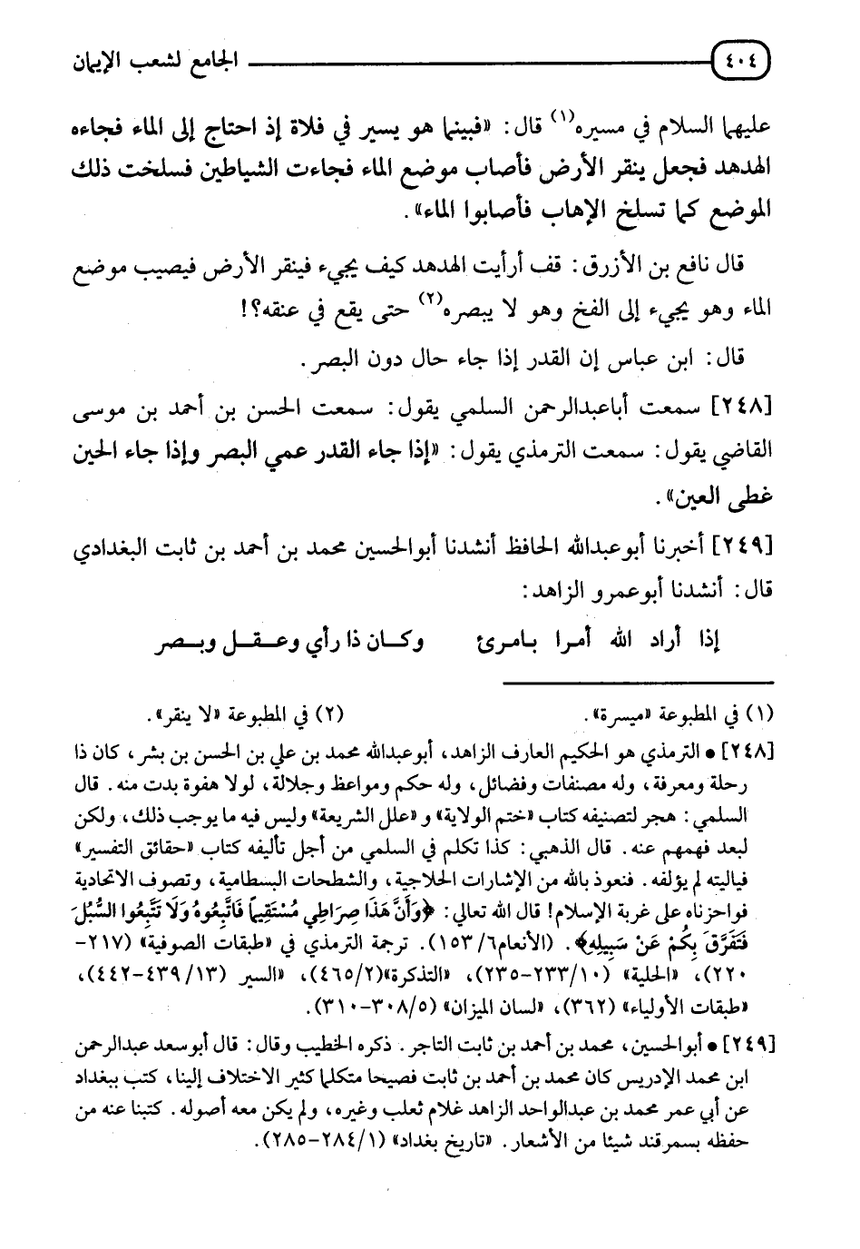 248 - سَمِعْتُ أَبَا عَبْدِ الرَّحْمَنِ السُّلَمِيَّ يَقُولُ: سَمِعْتُ الْحَسَنَ بْنَ أَحْمَدَ بْنِ مُوسَى الْقَاضِي يَقُولُ: سَمِعْتُ التِّرْمِذِيَّ يَقُولُ: " §إِذَا جَاءَ الْقَدَرُ عَمِيَ الْبَصَرُ، وَإِذَا جَاءَ الْحِينُ غَطَّى الْعَيْنَ "
