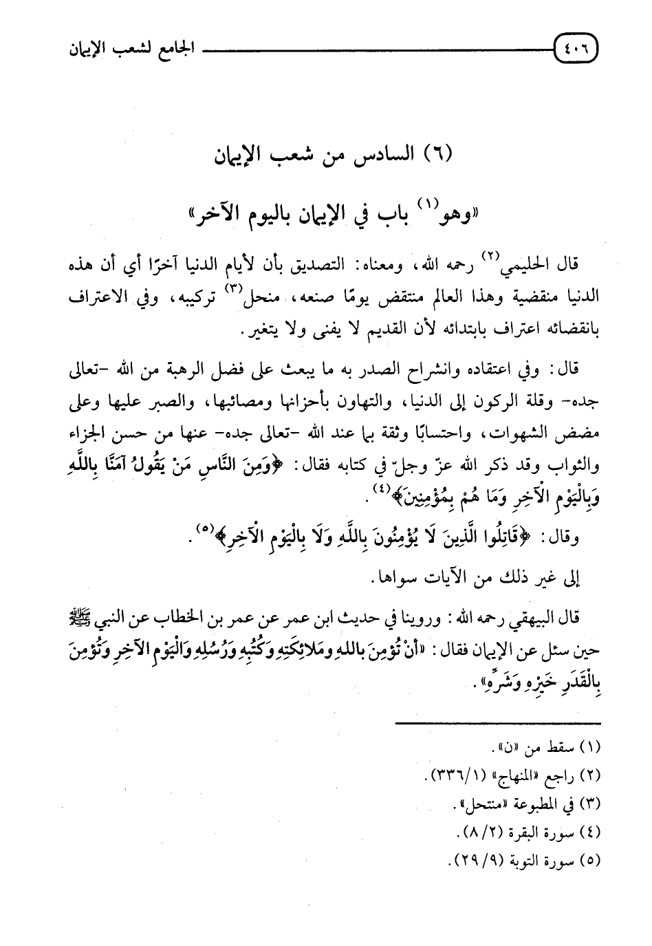 §السَّادِسُ مِنْ شُعَبِ الْإِيمَانِ، وَهُوَ بَابٌ فِي الْإِيمَانِ بِالْيَوْمِ الْآخِرِ قَالَ الْحَلِيمِيُّ رَحِمَهُ اللهُ: " وَمَعْنَاهُ التَّصْدِيقِ بِأَنَّ لِأَيَّامِ الدُّنْيَا آخِرًا أَيْ أَنَّ هَذِهِ الدُّنْيَا مُنْقَضِيَةٌ، وَهَذَا الْعَالَمُ مُنْتَقَضٌ يَوْمًا صُنْعُهُ مُنْحَلٌّ تَرْكِيبُهُ، وَفِي الِاعْتِرَافِ بانْقِضَائِهِ اعْتِرَافٌ بِابْتِدِائِهِ لِأَنَّ الْقَدِيمَ لَا يَفْنَى وَلَا يَتَغَيَّرُ " قَالَ: " وَفِي اعْتِقَادِهِ وَانْشِرَاحِ الصَّدْرِ بِهِ مَا يَبْعَثُ عَلَى فَضْلِ الرَّهْبَةِ مِنَ اللهِ تَعَالَى جَدُّهُ وَقِلَّةِ الرُّكُونِ إِلَى الدُّنْيَا وَالتَّهَاوُنِ بِأَحْزَانِهَا وَمَصَائِبِهَا وَالصَّبْرِ عَلَيْهَا وَعَلَى مَضَضِ الشَّهَوَاتِ، احْتِسَابًا وَثِقَةً بِمَا عِنْدَ اللهِ تَعَالَى جَدُّهُ عَنْهَا مِنْ حُسْنِ الْجَزَاءِ، وَالثَّوَابِ وَقَدْ ذَكَرَهُ اللهُ عَزَّ وَجَلَّ فِي كِتَابِهِ فَقَالَ: {وَمِنَ النَّاسِ مَنْ يَقُولُ: آمَنَّا بِاللهِ وَبِالْيَوْمِ الْآخِرِ، وَمَا هُمْ بِمُؤْمِنِينَ} [البقرة: 8]، وَقَالَ: {قَاتِلُوا الَّذِينَ لَا يُؤْمِنُونَ بِاللهِ وَلَا بِالْيَوْمِ الْآخِرِ} [التوبة: 29] إِلَى غَيْرِ ذَلِكَ مِنَ الْآيَاتِ سِوَاهَا "