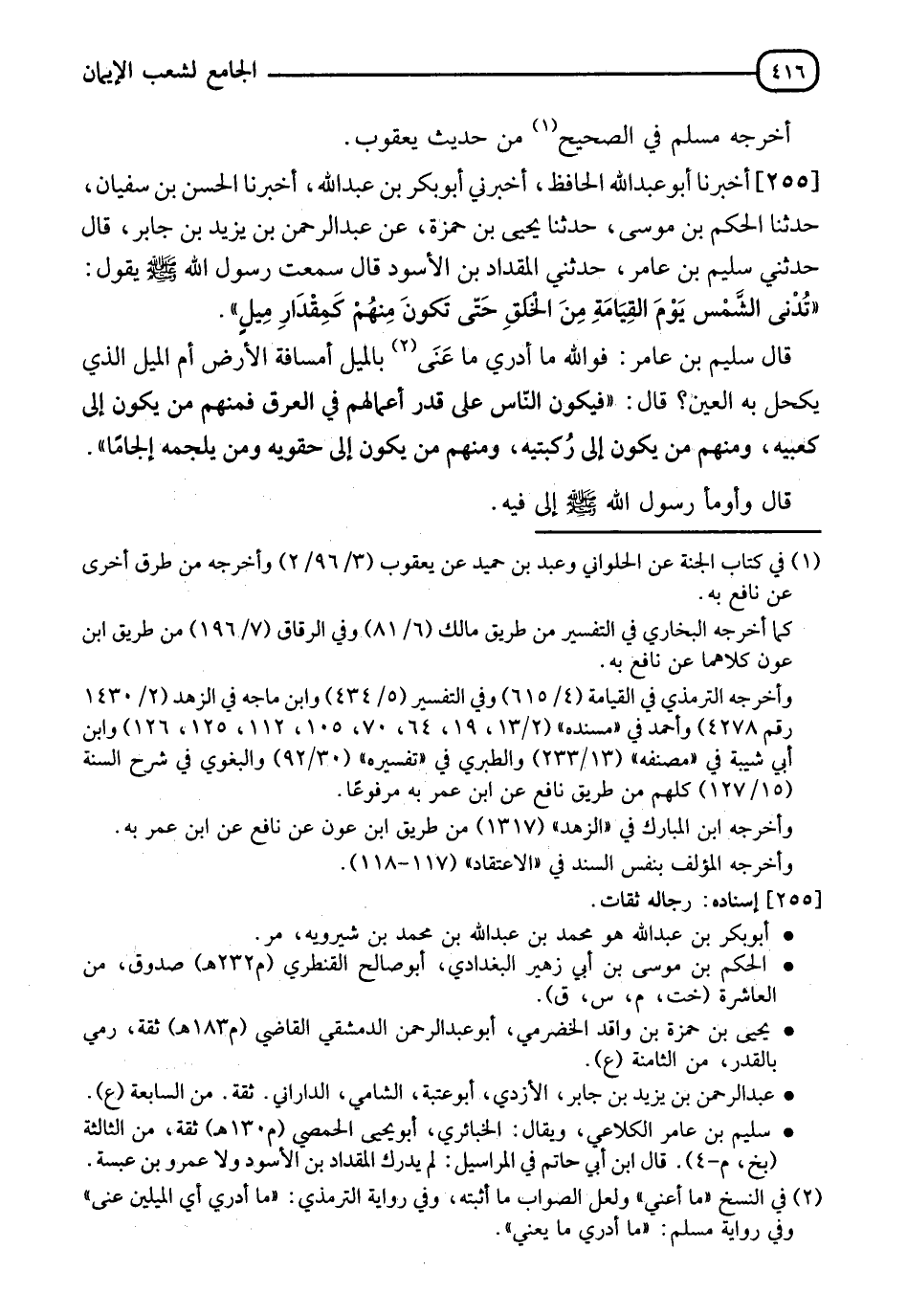 255 - أَخْبَرَنَا أَبُو عَبْدِ اللهِ الْحَافِظُ، أَخْبَرَنِي أَبُو بَكْرِ بْنُ عَبْدِ اللهِ، أَخْبَرَنَا الْحَسَنُ بْنُ سُفْيَانَ، حدثنا الْحَكَمُ بْنُ مُوسَى، حدثنا يَحْيَى بْنُ حَمْزَةَ، عَنْ عَبْدِ الرَّحْمَنِ بْنِ يَزِيدَ بْنِ جَابِرٍ قَالَ: حَدَّثَنِي سُلَيْمُ بْنُ عَامِرٍ، حَدَّثَنِي الْمِقْدَادُ بْنُ الْأَسْوَدِ قَالَ: سَمِعْتُ رَسُولَ اللهِ صَلَّى اللَّهُ عَلَيْهِ وَسَلَّمَ يَقُولُ: §" تُدْنَى الشَّمْسُ يَوْمَ الْقِيَامَةِ مِنَ الْخَلْقِ حَتَّى تَكُونَ مِنْهُمْ كَمِقْدَارِ مِيلٍ ". قَالَ سُلَيْمُ بْنُ عَامِرٍ: فَوَاللهِ مَا أَدْرِي مَا عَنَى بِالْمِيلِ أَمَسَافَةُ الْأَرْضِ أَمِ الْمِيلُ الَّذِي يُكَحَّلُ بِهِ الْعَيْنُ. قَالَ: " فَيَكُونُ النَّاسُ عَلَى قَدْرِ أَعْمَالِهِمْ فِي الْعَرَقِ فَمِنْهُمْ مَنْ يَكُونُ إِلَى كَعْبَيْهِ، وَمِنْهُمْ مَنْ يَكُونُ إِلَى رُكْبَتَيْهِ، وَمِنْهُمْ مَنْ يَكُونُ إِلَى حِقْوَيْهِ، ومَنْ يُلْجِمُهُ إِلْجَامًا " قَالَ: وَأَوْمَأَ رَسُولُ اللهِ صَلَّى اللَّهُ عَلَيْهِ وَسَلَّمَ إِلَى فِيهِ -[417]- رَوَاهُ مُسْلِمٌ فِي الصَّحِيحِ، عَنِ الْحَكَمِ بْنِ مُوسَى " وَقَدْ ذَكَرْنَا سَائِرَ الْأَحَادِيثِ فِيهِ فِي كِتَابِ الْبَعْثِ قَالَ اللهُ عَزَّ وَجَلَّ: {وَكُلَّ إِنْسَانٍ أَلْزَمْنَاهُ طَائِرَهُ فِي عُنُقِهِ، وَنُخْرِجُ لَهُ يَوْمَ الْقِيَامَةِ كِتَابًا يَلْقَاهُ مَنْشُورًا، اقْرَأْ كِتَابَكَ كَفَى بِنَفْسِكَ الْيَوْمَ عَلَيْكَ حَسِيبًا} [الإسراء: 14]، وَقَالَ عَزَّ وَجَلَّ: {إِنَّ عَلَيْكُمْ لَحَافِظِينَ كِرَامًا كَاتِبِينَ يَعْلَمُونَ مَا تَفْعَلُونَ} [الانفطار: 10]، وَقَالَ تَعَالَى: {عَنِ الْيَمِينِ وَعَنِ الشِّمَالِ قَعِيدٌ مَا يَلْفِظُ مِنْ قَوْلٍ إِلَّا لَدَيْهِ رَقِيبٌ عَتِيدٌ} [ق: 17]، وَقَالَ: {هَذَا كِتَابُنَا يَنْطِقُ عَلَيْكُمْ بِالْحَقِّ، إِنَّا كُنَّا نَسْتَنْسِخُ مَا كُنْتُمْ تَعْمَلُونَ} [الجاثية: 29] وَأَخْبَرَ أَنَّ الَّذِينَ يَقْرَءُونَ كُتُبَهُمْ يَقُولُونَ: {مَا لِهَذَا الْكِتَابِ لَا يُغَادِرُ صَغِيرَةً وَلَا كَبِيرَةً إِلَّا أَحْصَاهَا}، وَأَنَّ مَنْ أُوتِيَ كِتَابَهُ بِيَمِينِهِ فَيَقُولُ: {هَاؤُمُ اقْرَأُوا كِتَابِيَهْ، إِنِّي ظَنَنْتُ أَنِّي مُلَاقٍ حِسَابِيَهْ فَهُوَ فِي عِيشَةٍ رَاضِيَةٍ، فِي جَنَّةٍ عَالِيَةٍ}، {وَأَمَّا مَنْ أُوتِيَ كِتَابَهُ بِشِمَالِهِ فَيَقُولُ يَا لَيْتَنِي لَمْ أُوتَ كِتَابِيَهْ، وَلَمْ أَدْرِ مَا حِسَابِيَهْ، يَا لَيْتَهَا كَانَتِ الْقَاضِيَةَ} [الحاقة: 25]
