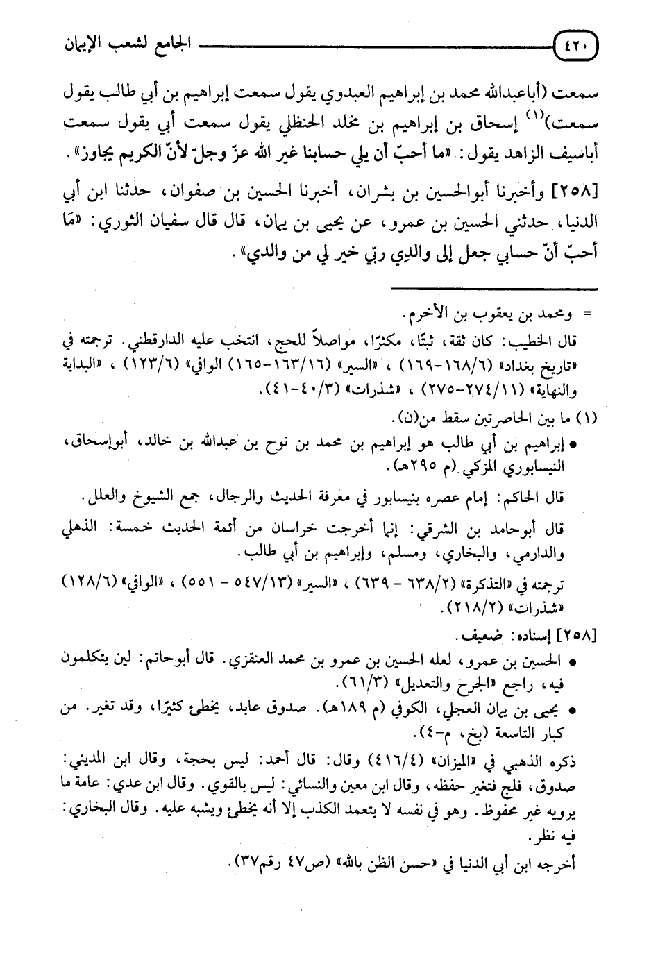 258 - وَأَخْبَرَنَا أَبُو الْحُسَيْنِ بْنُ بِشْرَانَ، أَخْبَرَنَا الْحُسَيْنُ بْنُ صَفْوَانَ، حدثنا ابْنُ أَبِي الدُّنْيَا، حَدَّثَنِي الْحُسَيْنُ بْنُ عَمْرٍو، عَنْ يَحْيَى بْنِ يَمَانٍ قَالَ: قَالَ سُفْيَانُ الثَّوْرِيُّ: §" مَا أُحِبُّ أَنَّ حِسَابِي جُعِلَ إِلَى وَالِدِي رَبِّي خَيْرٌ لِي مِنْ وَالِدِي " -[421]- قَالَ الْبَيْهَقِيُّ رَحِمَهُ اللهُ: " وَقَدْ رُوِيَ في مَعْنَاهُ حَدِيثٌ مُسْنَدٌ لَكِنَّهُ يُشْبِهُ أَنْ يَكُونَ مَوْضُوعًا، فَلَمْ أُجْسَرْ عَلَى نَقْلِهِ، ثُمَّ إِنِّي نَقَلْتُهُ لِشُهْرَتِهِ بَيْنَ الْمُذْكِرِينَ وَأَنَا أَبْرَأُ مِنْ عَهْدِهِ "