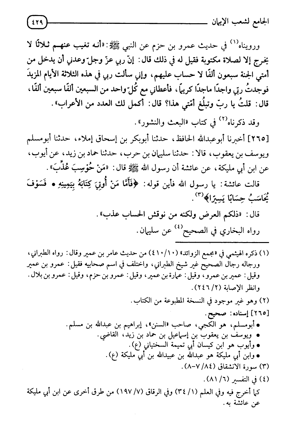 265 - أَخْبَرَنَا أَبُو عَبْدِ اللهِ الْحَافِظُ، حدثنا أَبُو بَكْرِ بْنُ إِسْحَاقَ إِمْلَاءً، حدثنا أَبُو مُسْلِمٍ، وَيُوسُفُ بْنُ يَعْقُوبَ قَالَا، حدثنا سُلَيْمَانُ بْنُ حَرْبٍ، حَدَّثَنَا حَمَّادُ بْنُ زَيْدٍ، عَنْ أَيُّوبَ، عَنِ ابْنِ أَبِي مُلَيْكَةَ، عَنْ عَائِشَةَ، أَنَّ رَسُولَ اللهِ صَلَّى اللَّهُ عَلَيْهِ وَسَلَّمَ قَالَ: " " §مَنْ حُوسِبَ عُذِّبَ " قَالَتْ عَائِشَةُ: يَا رَسُولَ اللهِ، فَأَيْنَ قَوْلُهُ: {فَأَمَّا مَنْ أُوتِيَ كِتَابَهُ بِيَمِينِهِ، فَسَوْفَ يُحَاسَبُ حِسَابًا يَسِيرًا} [الانشقاق: 8] قَالَ: " ذَلُكُمُ الْعَرْضُ، وَلَكِنَّهُ مَنْ نُوقِشَ الْحِسَابَ عُذِّبَ " رَوَاهُ الْبُخَارِيُّ فِي الصَّحِيحِ، عَنْ سُلَيْمَانَ -[430]- وَرَوَاهُ مُسْلِمٌ، عَنْ أَبِي الرَّبِيعِ، عَنْ حَمَّادٍ
