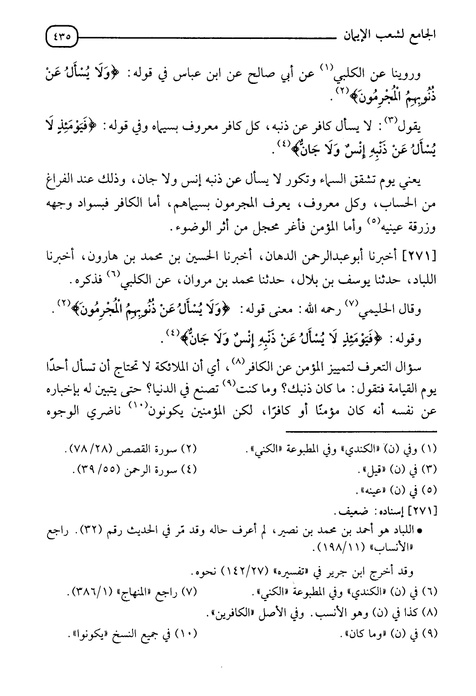 271 - أَخْبَرَنَا أَبُو عَبْدِ الرَّحْمَنِ الدَّهَّانُ، أَخْبَرَنَا الْحُسَيْنُ بْنُ مُحَمَّدِ بْنِ هَارُونَ، أَخْبَرَنَا اللَّبَّادُ، حدثنا يُوسُفُ بْنُ بِلَالٍ، حدثنا مُحَمَّدُ بْنُ مَرْوَانَ، عَنِ الْكَلْبِيِّ فَذَكَرَهُ وَقَالَ الْحَلِيمِيُّ رَحِمَهُ اللهُ: " مَعْنَى قَوْلِهِ: وَلَا يُسْأَلُ عَنْ ذُنُوبِهِمُ الْمُجْرِمُونَ، وَقَوْلِهِ: فَيَوْمَئِذٍ لَا يُسْئلُ عَنْ ذَنْبِهِ إِنْسٌ وَلَا جَانٌّ سُؤَالُ التَّعَرُّفِ لتَمْيِيزِ الْمُؤْمِنِ عَنِ الْكَافِرِ، أَي إِنَّ الْمَلَائِكَةَ لَا تَحْتَاجُ أَنْ تَسْأَلَ أَحَدًا يَوْمَ الْقِيَامَةِ فَتَقُولُ: مَا كَانَ ذَنْبُكَ، وَمَا كُنْتَ تَصْنَعُ فِي الدُّنْيَا حَتَّى يَتَبَيَّنَ لَهُ بِأخْبَارِهِ عَنْ نَفْسِهِ أَنَّهُ كَانَ مُؤْمِنًا أَوْ كَافِرًا لَكِنَّ الْمُؤْمِنِينَ يَكُونُونَ نَاضِرِي الْوُجُوهِ -[436]- مَشْرُوحِي الصُّدُورِ، وَالْمُشْرِكِينَ يَكُونُونَ سُودَ الْوُجُوهِ زُرْقًا مَكْرُوبِينَ، فَهُمْ إِذَا كُلِّفُوا سَوْقَ الْمُجْرِمِينَ إِلَى النَّارِ، وَتَمْيِيزَهَمُ فِي الْمَوْقِفِ عَنِ الْمُؤْمِنِينَ كَفَتْهُمْ مَنَاظِرُهُمْ عَنْ تَعَرُّفِ ذُنُوبِهِمْ وَاللهُ أَعْلَمُ " وقَالَ الْبَيْهَقِيُّ رَحِمَهُ اللهُ: " وَهَذَا الَّذِي ذَكَرَهُ الْحَلِيمِيُّ أَشْبَهُ أَنْ يَكُونَ مَأْخُوذًا مِمَّا رُوِّينَا عَنْ تَفْسِيرِ الْكَلْبِيِّ، وَبِمَعْنَاهُ ذَكَرَ مُقَاتِلُ بْنُ سُلَيْمَانَ فِي الْآيَةِ الْأَخِيرَةِ غَيْرَ أَنَّهُ لَمْ يَذْكُرُ الْفَرَاغَ مِنَ الْحِسَابِ، فَقَالَ: فِي قَوْلِهِ تَعَالَى: وَلَا يُسْئلُ عَنْ ذُنُوبِهِمُ الْمُجْرِمُونَ ذَلِكَ أَنَّ كُفَّارَ مَكَّةَ قَالُوا: لَوْ أَنَّ عِنْدَنَا ذِكْرًا يَعْنِي خَبَرًا مِنَ الْأَوَّلِينَ بِمَ أُهْلِكُوا، فَأَنْزَلَ اللهُ عَزَّ وَجَلَّ: وَلَا يُسْئلُ عَنْ ذُنُوبِهِمُ الْمُجْرِمُونَ يَقُولُ: لَا يُسْئلُ مُجْرُمُو هَذِهِ الْأُمَّةِ عَنْ ذُنُوبِ الْأُمَمِ الْمَاضِيَةِ الَّذِينَ عُذِّبُوا فِي الدُّنْيَا، فَإِنَّ اللهَ تَعَالَى قَدْ أَحْصَى أَعْمَالَهُمُ الْخَبِيثَةَ وَعَلِمَهَا "