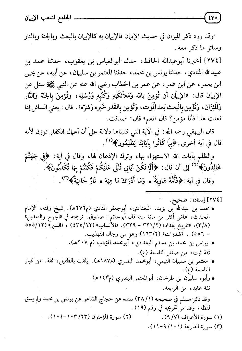 274 - أَخْبَرَنَا أَبُو عَبْدِ اللهِ الْحَافِظُ، حدثنا أَبُو الْعَبَّاسِ بْنُ يَعْقُوبَ، حدثنا مُحَمَّدُ بْنُ عَبْيدِ اللهِ الْمُنَادِي، حدثنا يُونُسُ بْنُ مُحَمَّدٍ، حدثنا الْمُعْتَمِرُ بْنُ سُلَيْمَانَ، عَنْ أَبِيهِ، عَنْ يَحْيَى بْنِ يَعْمَرَ، عَنِ ابْنِ عُمَرَ، عَنْ عُمَرَ بْنِ الْخَطَّابِ رَضِيَ اللهُ عَنْهُ، عنِ النَّبِيِّ صَلَّى اللَّهُ عَلَيْهِ وَسَلَّمَ سُئِلَ عَنِ الْإِيمَانِ قَالَ: " §الْإِيمَانُ أَنْ تُؤْمِنَ بِاللهِ، وَمَلَائِكَتِهِ، وَكُتُبِهِ وَرُسُلِهِ، وَتُؤْمِنَ بِالْجَنَّةِ وَالنَّارِ، وَالْمِيزَانِ، وتُؤْمِنَ بِالْبَعْثِ بَعْدَ الْمَوْتِ، وَتُؤْمِنَ بِالْقَدَرِ خَيْرِهِ وَشَرِّهِ ". قَالَ - يَعْنِي السَّائِلَ -: إِذَا فَعَلْتُ هَذَا فَأَنَا مُؤْمِنٌ؟ قَالَ: " نَعَمْ ". قَالَ: صَدَقْتَ قَالَ الْبَيْهَقِيُّ رَحِمَهُ اللهُ: " فِي الْآيَةِ الَّتِي كَتَبْنَاهَا دَلَالَةٌ عَلَى أَنَّ أَعْمَالَ الْكُفَّارِ تُوزَنُ لِأَنَّهُ قَالَ فِي آيَةٍ أُخْرَى: {بِمَا كَانُوا بِآيَاتِنَا يَظْلِمُونَ} [الأعراف: 9]، وَالظُّلْمُ بِآيَاتِ اللهِ الِاسْتِهْزَاءُ بِهَا، وَتَرْكُ الْإِذْعَانِ لَهَا، وَقَالَ فِي آيَةٍ: {فِي جَهَنَّمَ خَالِدُونَ} [المؤمنون: 103] إِلَى أَنْ قَالَ: {أَلَمْ تَكُنْ آيَاتِي تُتْلَى عَلَيْكُمْ فَكُنْتُمْ بِهَا تُكَذِّبُونَ} [المؤمنون: 105]، وَقَالَ فِي آيَةٍ: {فَأُمُّهُ هَاوِيَةٌ وَمَا أَدْرَاكَ مَا هِيَهْ نَارٌ حَامِيَةٌ} [القارعة: 10]، -[439]- وَهَذَا الْوَعِيدُ بِالْإِطْلَاقِ لَا يَكُونُ إِلَّا لِلْكُفَّارِ، فَإِذَا جُمِعَ بَيْنَهُ وَبَيْنَ قَوْلِهِ: {وَإِنْ كَانَ مِثْقَالَ حَبَّةٍ مِنْ خَرْدَلٍ أَتَيْنَا بِهَا} [الأنبياء: 47] ثَبَتَ أَنَّ الْكُفَّارَ يُسْأَلُونَ عَنْ كُلِّ مَا خَالَفُوا بِهِ الْحَقَّ مِنْ أَصْلِ الدِّينِ وَفُرُوعِهِ، إِذْ لَوْ لَمْ يُسْأَلُوا عَمَّا وَافَقُوا فِيهِ أَصْلَ تَدَيُّنِهِمْ مِنْ ضُرُوبِ تَعاطِيهِمْ، وَلَمْ يُحَاسَبُوا بِهَا لَمْ يُعْتَدَّ بِهَا فِي الْوَزْنِ أَيْضًا، وَإِذَا كَانَتْ مَوْزُونَةً فِي وَقْتِ الْوَزْنِ دَلَّ ذَلِكَ عَلَى أَنَّهُم مُحَاسَبُونَ بِهَا فِي مَوْقِفِ الْحِسَابِ وَاللهُ أَعْلَمُ، وَهَذَا عَلَى قَوْلِ مَنْ قَالَ فِي الْكُفَّارِ أَنَّهُمْ مُخَاطَبُونَ بِالشَّرَائِعِ، وَهُوَ الصَّحِيحُ لِأَنَّ اللهَ عَزَّ وَجَلَّ يَقُولُ: {وَوَيْلٌ لِلْمُشْرِكِينَ الَّذِينَ لَا يُؤْتُونَ الزَّكَاةَ} [فصلت: 6] فَتَوَعَّدَهُمْ عَلَى مَنْعِ الزَّكَاةِ وَأَخْبَرَ عَنِ الْمُجْرِمِينَ أَنَّهُمْ يُقَالُ لَهُمْ {مَا سَلَكَكُمْ فِي سَقَرَ قَالُوا: لَمْ نَكُ مِنَ الْمُصَلِّينَ، وَلَمْ نَكُ نُطْعِمُ الْمِسْكِينَ، وَكُنَّا نَخُوضُ مَعَ الْخَائِضِينَ، وَكُنَّا نُكَذِّبُ بِيَوْمِ الدِّينِ حَتَّى أَتَانَا الْيَقِينُ} [المدثر: 42] فَبَانَ بِهَذَا أَنَّ الْمُشْرِكِينَ مُخَاطَبُونَ بِالْإِيمَانِ بِالْبَعْثِ، وَبِإِقَامِ الصَّلَاةِ وَإِيتَاءِ الزَّكَاةِ، وَأَنَّهُمْ مَسْئُولُونَ عَنْهَا مُخَاطَبُونَ بِهَا مُجْزَوْنَ عَلَى مَا أَخَلُّوا بِهِ مِنْهَا وَاللهُ أَعْلَمُ، وَاخْتَلَفُوا فِي كَيْفِيَّةِ الْوَزْنِ، فَذَهَبَ ذَاهِبُونَ إِلَى أَنَّ الْكَافِرَ قَدْ يَكُونُ مِنْهُ صِلَةُ الْأَرْحَامِ وَمُوَاسَاةُ النَّاسِ، وَرَحْمَةُ الضَّعِيفِ وَإِغاثةُ اللهْفَانِ، وَالدَّفْعُ عَنِ الْمَظْلُومِ، وَعِتْقُ الْمَمْلُوكِ، وَنَحْوُهَا مِمَّا لَوْ كَانَتْ مِنَ الْمُسْلِمِ لَكَانَتْ بِرًّا وَطَاعَةً فَمَنْ كَانَ لَهُ أَمْثَالُ هَذِهِ الْخَيْرَاتِ مِنَ الْكُفَّارِ، فَإِنَّهَا تُجْمَعُ وَتُوضَعَ فِي مِيزَانِهِ لِأَنَّ اللهَ تَعَالَى قَالَ: {فَلَا تُظْلَمُ نَفْسٌ شَيْئًا} [الأنبياء: 47] فَتَأْخُذُ مِنْ مِيزَانِهِ شَيْئًا غَيْرَ أَنَّ الْكُفْرَ إِذَا قَابَلَهَا رَجَ