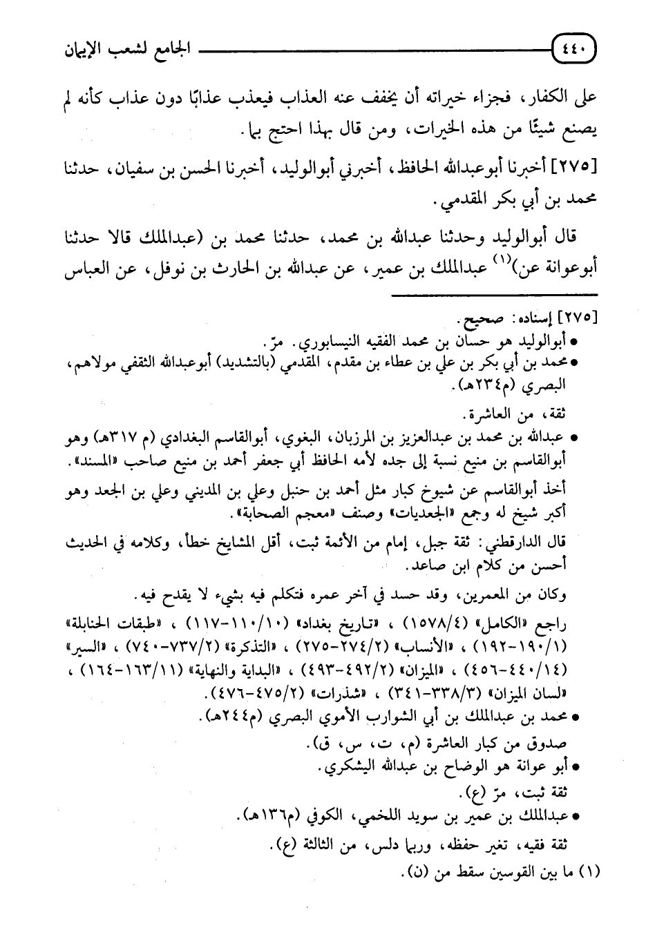 275 - أَخْبَرَنَا أَبُو عَبْدِ اللهِ الْحَافِظُ، أَخْبَرَنِي أَبُو الْوَلِيدِ، أَخْبَرَنَا الْحَسَنُ بْنُ سُفْيَانَ، حدثنا مُحَمَّدُ بْنُ أَبِي بَكْرٍ الْمُقَدَّمِيُّ قَالَ أَبُو الْوَلِيدِ: وحدثنا عَبْدُ اللهِ بْنُ مُحَمَّدٍ، حدثنا مُحَمَّدُ بْنُ عَبْدِ الْمَلِكِ قَالَا، حدثنا أَبُو عَوَانَةَ، عَنْ عَبْدِ الْمَلِكِ بْنِ عُمَيْرٍ، عَنْ عَبْدِ اللهِ بْنِ الْحَارِثِ بْنِ نَوْفَلٍ، عَنِ الْعَبَّاسِ -[441]- بْنِ عَبْدِ الْمُطَّلِبِ قَالَ: قُلْتُ يَا رَسُولَ اللهِ، §هَلْ نَفَعْتَ أَبَا طَالِبٍ بِشَيْءٍ فَإِنَّهُ كَانَ يحوطك وَيَغْضَبُ لَكَ؟ قَالَ: " نَعَمْ، هُوَ فِي ضَحْضَاحٍ مِنَ النَّارِ، وَلَوْلَا أَنَا لَكَانَ فِي الدَّرْكِ الْأَسْفَلِ مِنَ النَّارِ " رَوَاهُ الْبُخَارِيُّ فِي الصَّحِيحِ، عَنْ مُوسَى بْنِ إِسْمَاعِيلَ، عَنْ أَبِي عَوَانَةَ وَرَوَاهُ مُسْلِمٌ، عَنْ مُحَمَّدِ بْنِ أَبِي بَكْرٍ وَابْنُ أَبِي الشَّوَارِبِ قَالَ الْبَيْهَقِيُّ رَحِمَهُ اللهُ: " وَذَهَبَ ذَاهِبُونَ إِلَى أَنَّ خَيْرَاتِ الْكَافِرِ، لَا تُوزَنُ لِيُجْزى بِهَا بِتَخْفِيفِ الْعَذَابِ عَنْهُ، وَإِنَّمَا تُوزَنُ قَطْعًا لِحُجَّتِهِ حَتَّى إِذَا قَابَلَهَا الْكُفْرُ رَجَحَ بِهَا وَأَحْبَطَهَا، أَوْ لَا تُوزَنُ أَصْلًا، وَلَكِنْ يُوضَعُ كُفْرُهُ أَوْ كُفْرُهُ وَسَائِرُ سَيِّئَاتِهِ فِي إِحْدَى كِفَّتَيْهِ، ثُمَّ يُقَالُ لَهُ: هَلْ لَكَ مِنْ طَاعَةٍ نَضَعُهَا فِي الْكِفَّةِ الْأُخْرَى، فَلَا يَجِدُهَا فَيَتَثَاقَلُ الْمِيزَانُ فَتَرْتَفِعُ الْكِفَّةُ الْفَارِغَةُ، وَتَبْقَى الْكِفَّةُ الْمَشْغُولَةُ فَذَلِكَ خِفَّةُ مِيزَانِهِ، فَأَمَّا خَيْرَاتُهُ فَإِنَّهَا لَا تُحْسَبُ بِشَيْءٍ مِنْهَا مَعَ الْكُفْرِ قَالَ اللهُ عَزَّ وَجَلَّ: {وَقَدِمْنَا إِلَى مَا عَمِلُوا مِنْ عَمَلٍ فَجَعَلْنَاهُ هَبَاءً مَنْثُورًا} [الفرقان: 23] "
