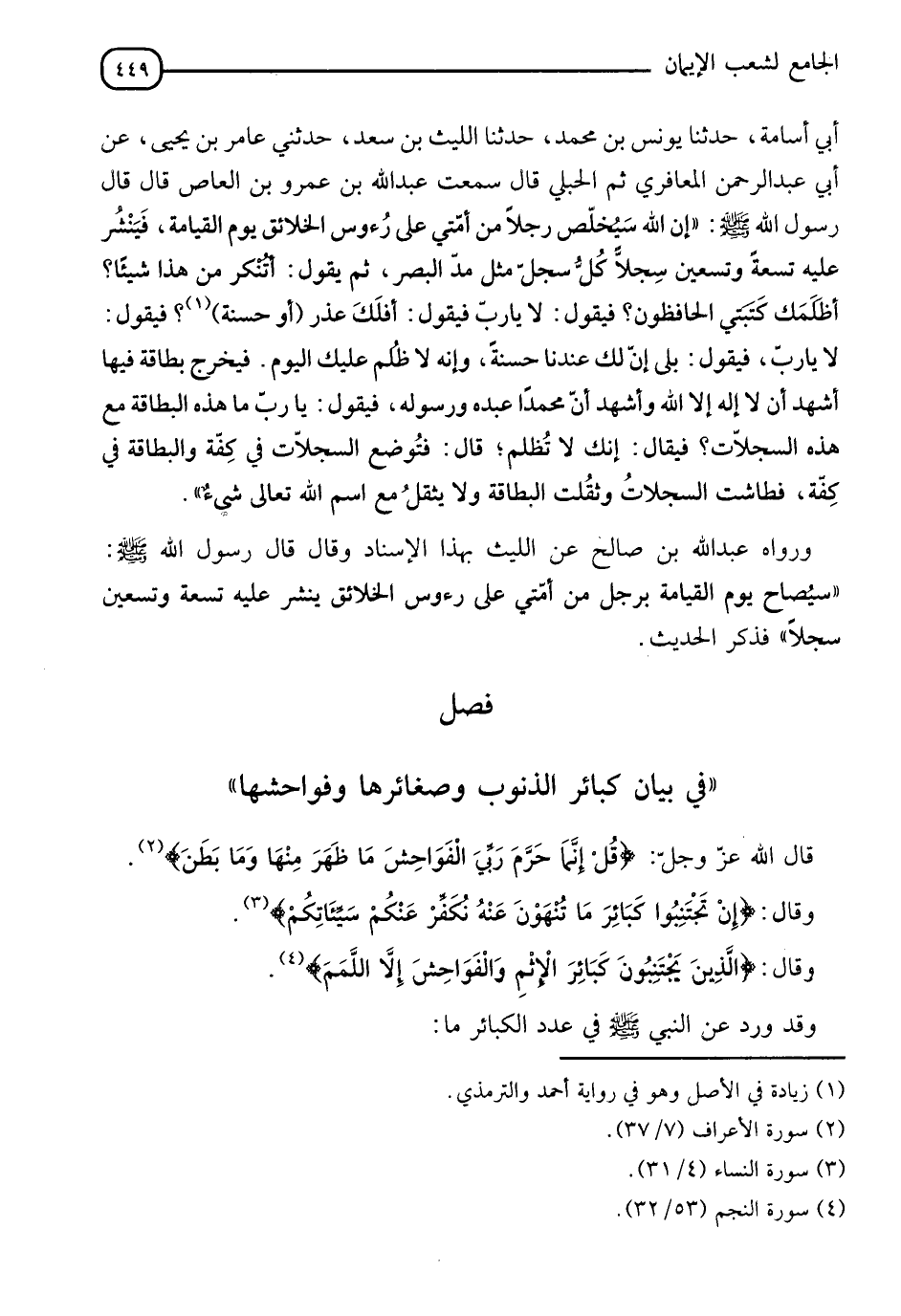 §فَصْلٌ فِي بَيَانِ كَبَائِرِ الذُّنُوبِ وَصَغَائِرِهَا وَفَوَاحِشِهَا قَالَ اللهُ عَزَّ وَجَلَّ: {قُلْ إِنَّمَا حَرَّمَ رَبِّيَ الْفَوَاحِشَ مَا ظَهَرَ مِنْهَا وَمَا بَطَنَ} [الأعراف: 33]، وَقَالَ: {إِنْ تَجْتَنِبُوا كَبَائِرَ مَا تُنْهَوْنَ عَنْهُ نُكَفِّرْ عَنْكُمْ سَيِّئَاتِكُمْ} [النساء: 31]، وَقَالَ: {الَّذِينَ يَجْتَنِبُونَ كَبَائِرَ الْإِثْمِ وَالْفَوَاحِشَ إِلَّا اللَّمَمَ} [النجم: 32]، وَقَدْ وَرَدَ عَنِ النَّبِيُّ صَلَّى اللَّهُ عَلَيْهِ وَسَلَّمَ فِي عَدَدِ الْكَبَائِرِ مَا.